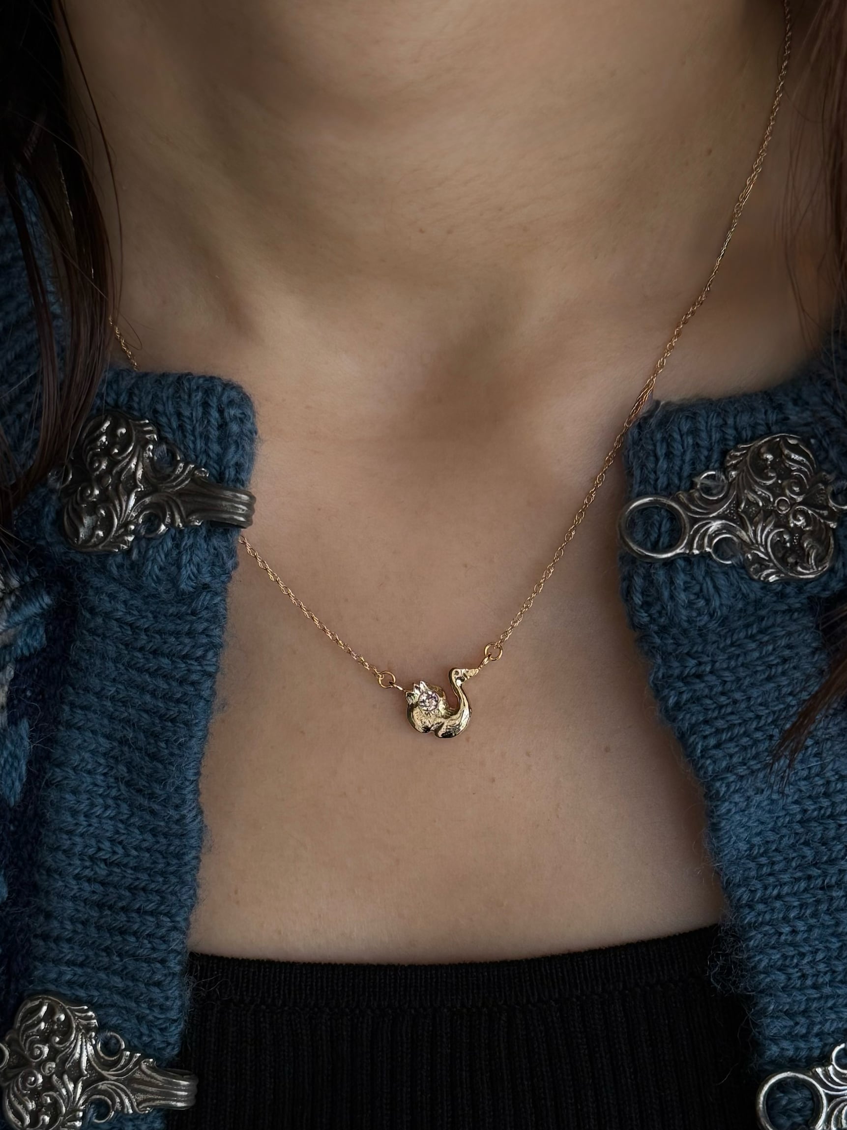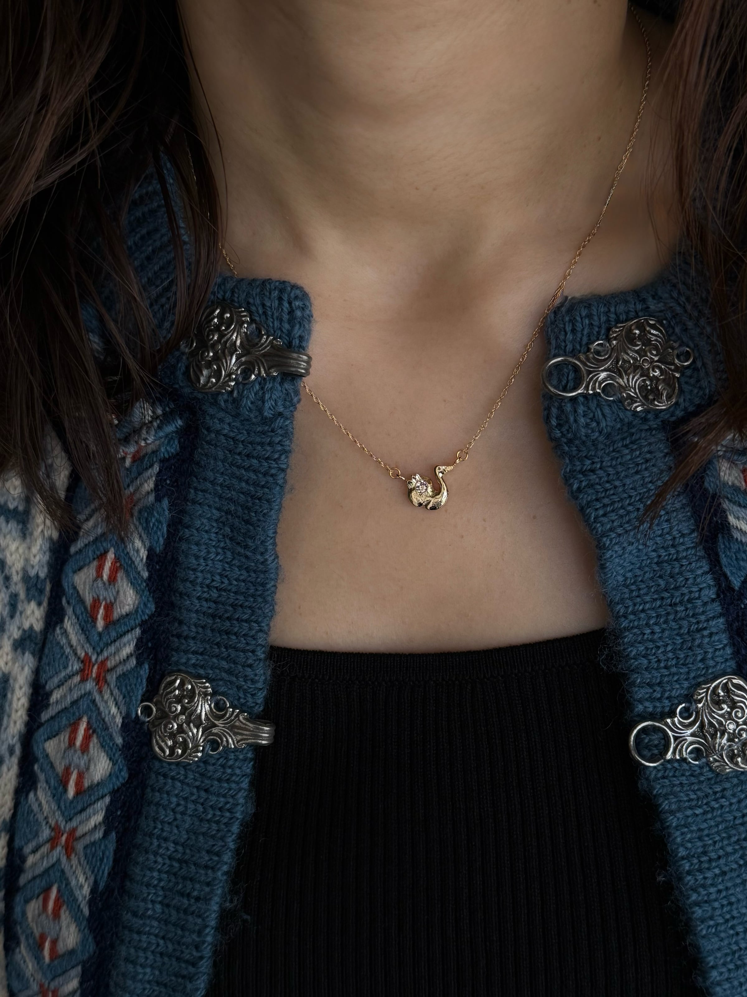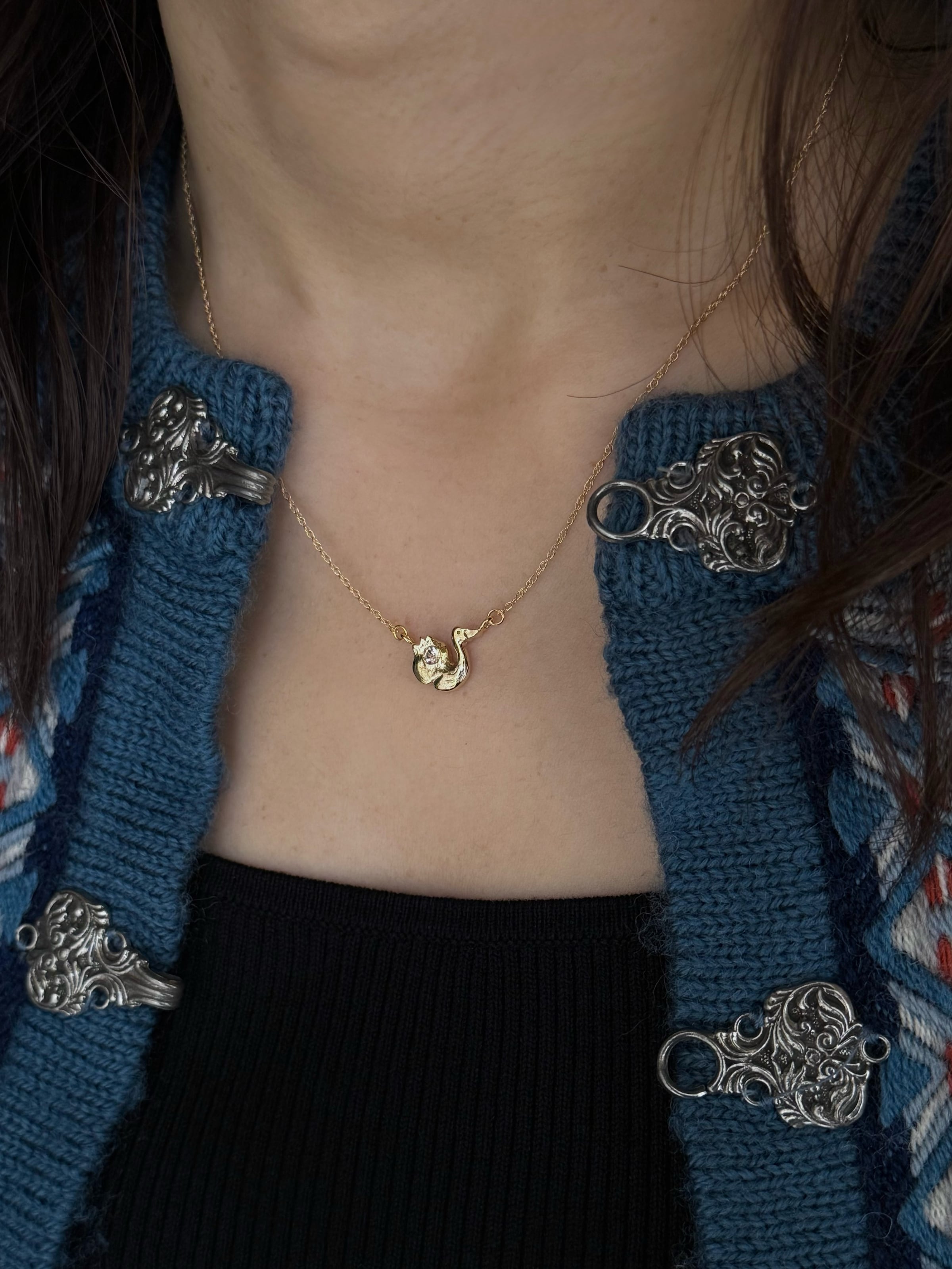 A necklace featuring “Sophia,” a baby swan tracing gentle curves with its tiny form.