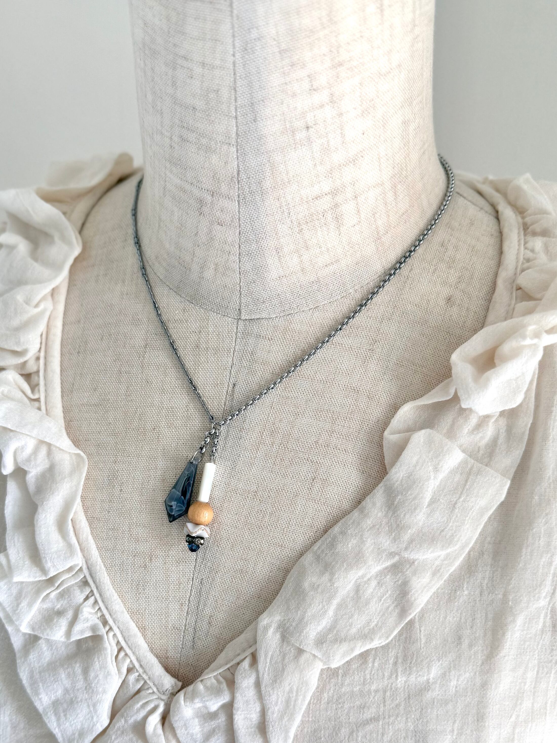 mother of pearl, vintage glass / wood / acrylic beads, stainless chain