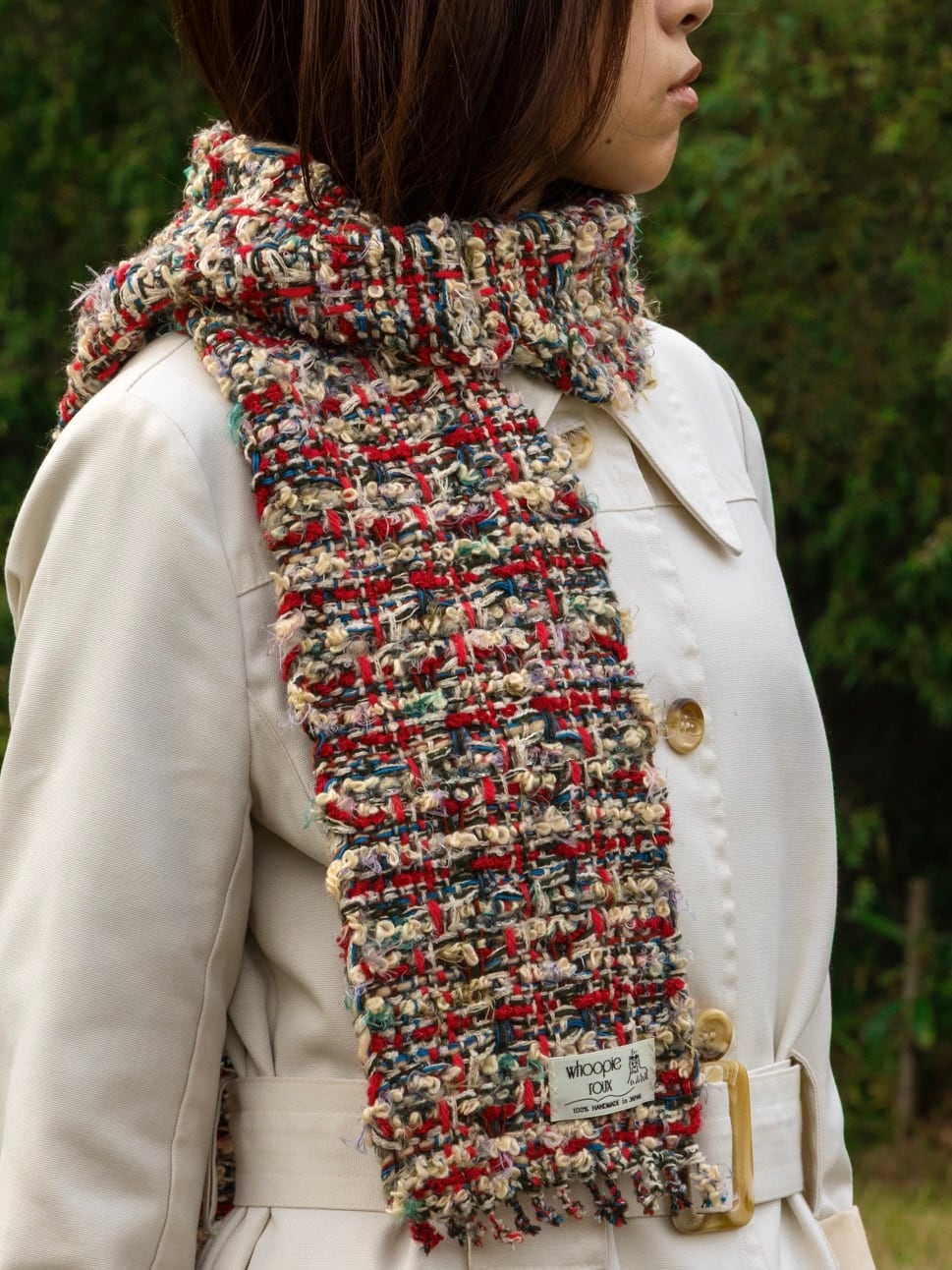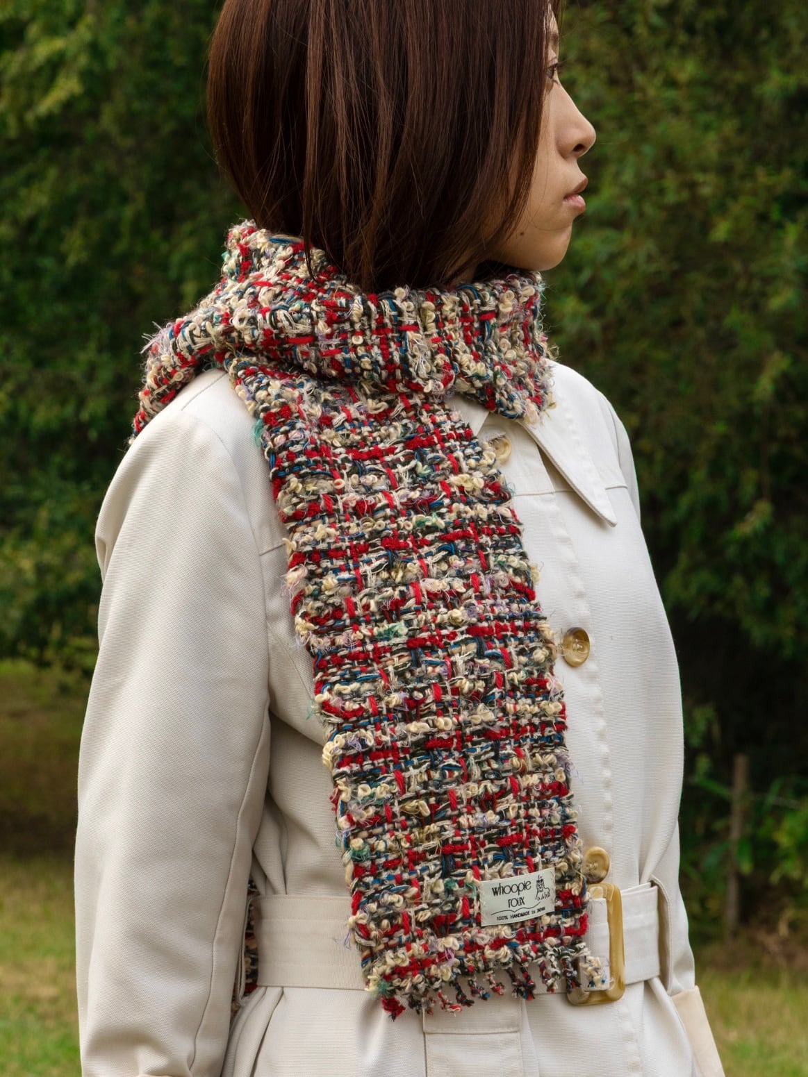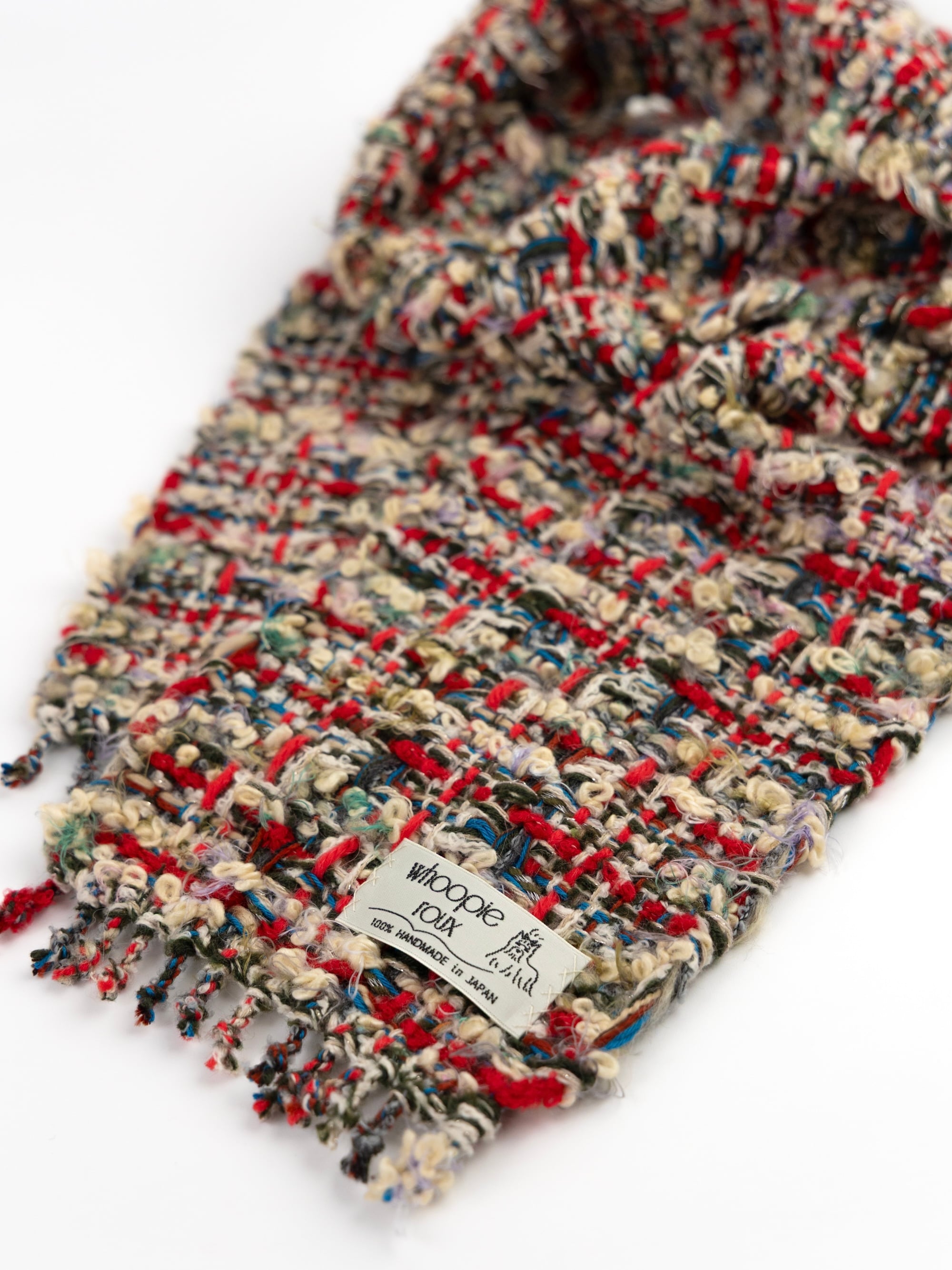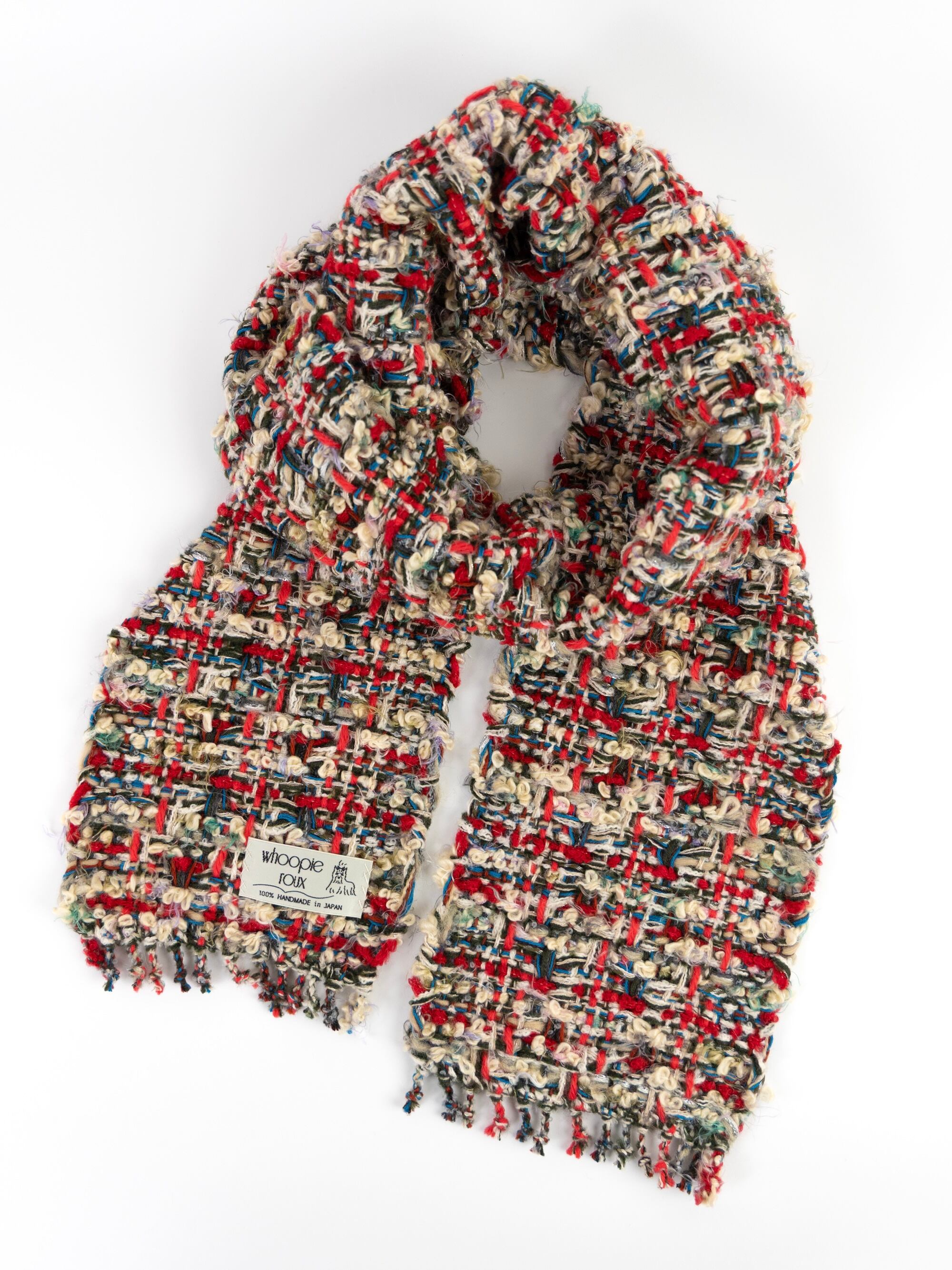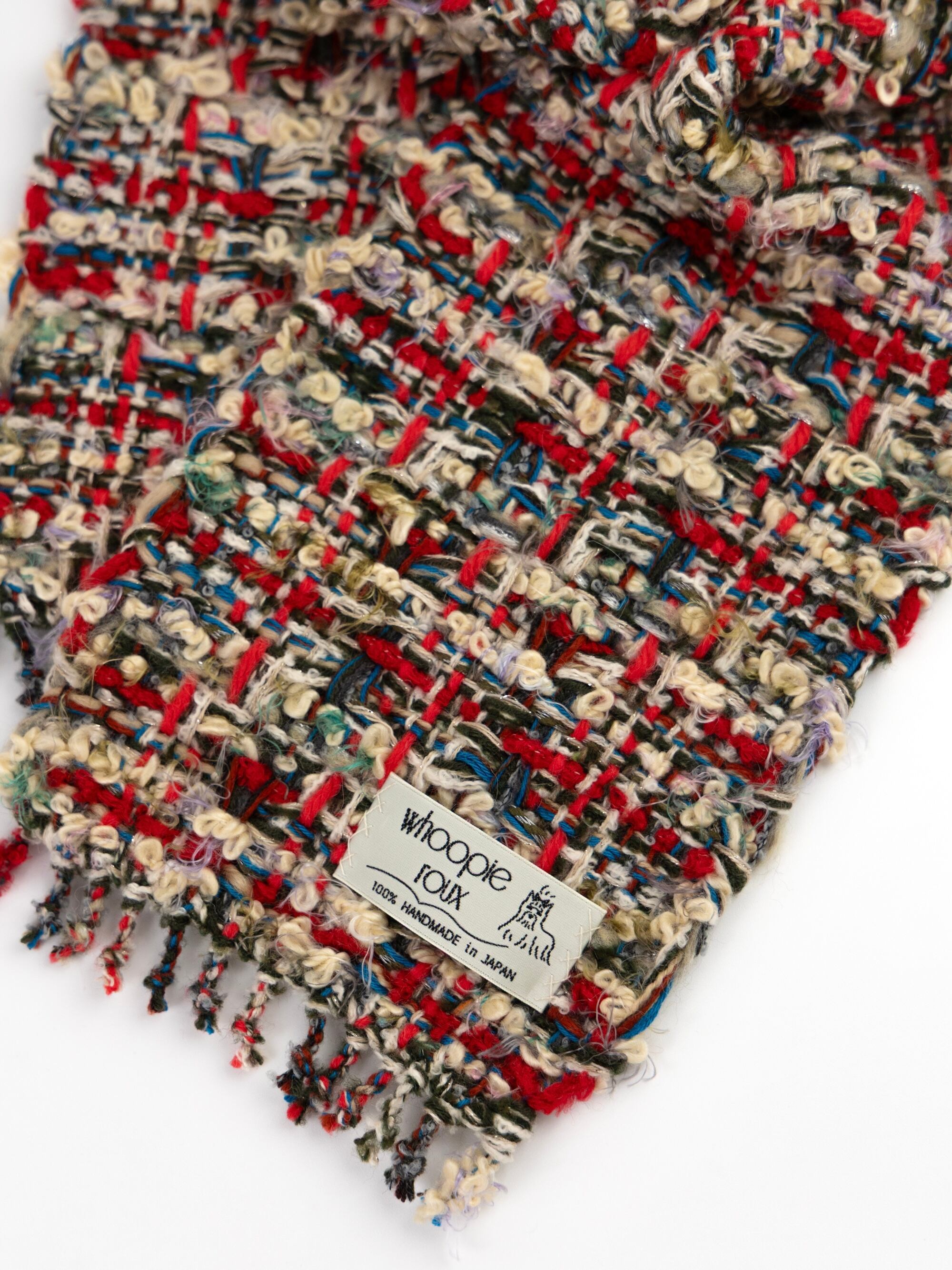 Each handwoven tweed scarf is a whoopie roux original, intricate yet delicate with a touch of cuteness, created from carefully selected leftover yarns from apparel factories—some of which were originally used by high-end brands. (Even the enchanting sparkling metallic threads are soft and gentle to the touch.)