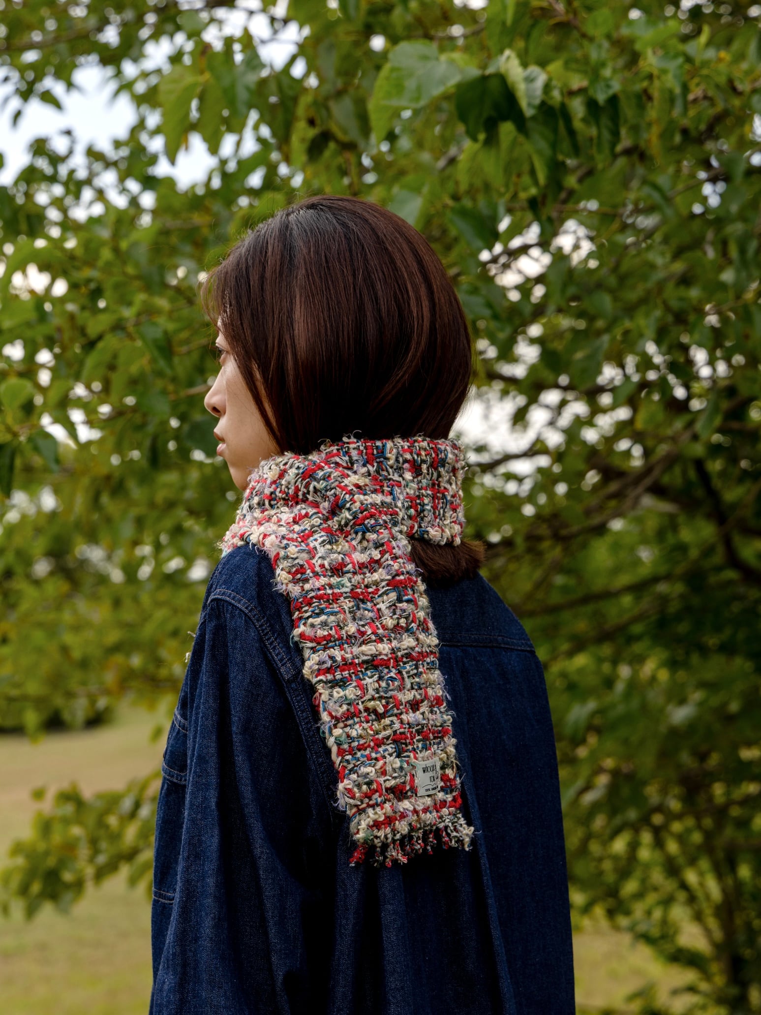 多くの色や質感が織り交ぜられたオリジナルデザインの手織りツイードは、巻くだけで顔周りに彩りを加え、肌色もきれいに見せてくれます。