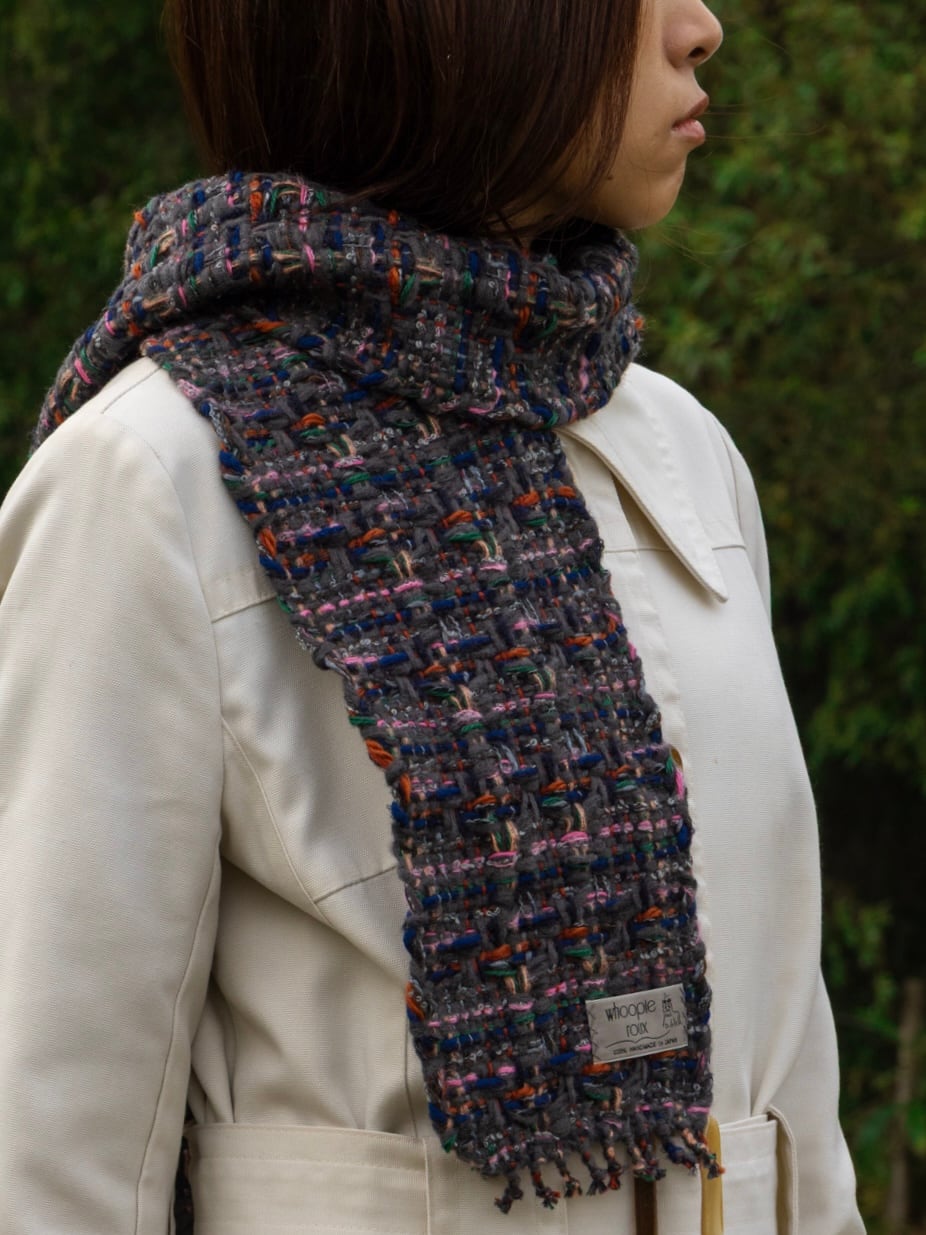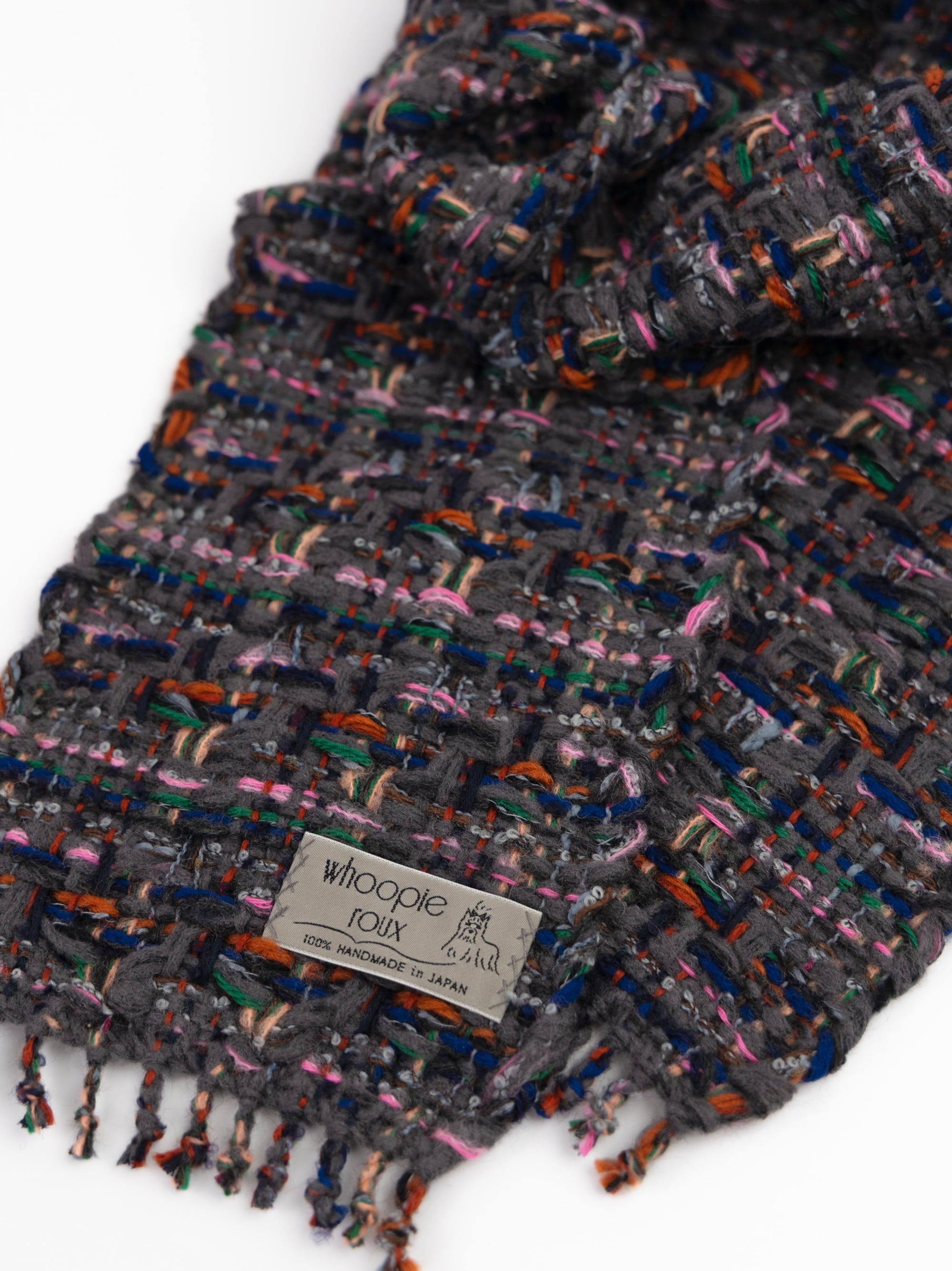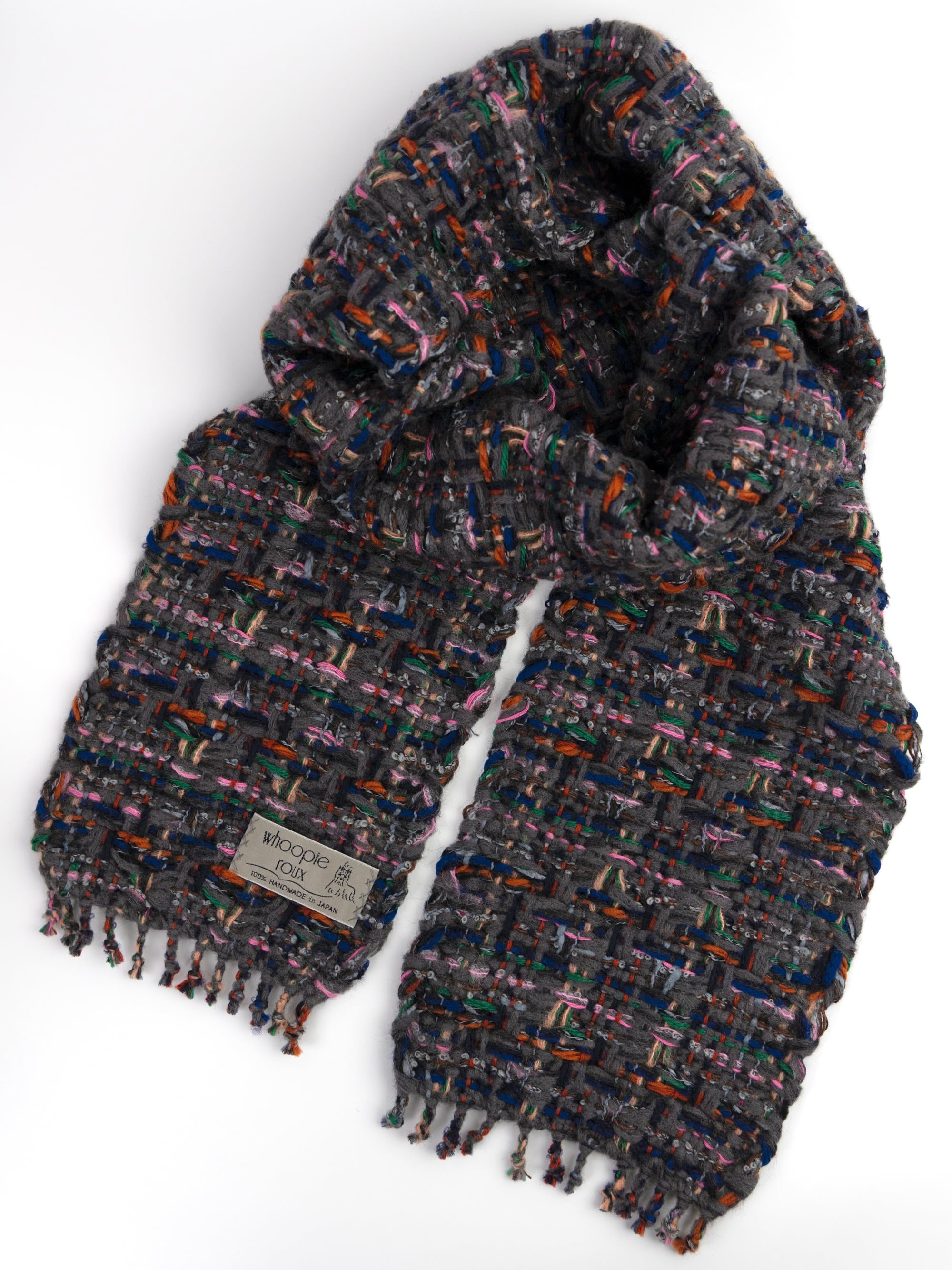 Each handwoven tweed scarf is a whoopie roux original, created from carefully selected leftover yarns from apparel factories—some of which were originally used by high-end brands.
