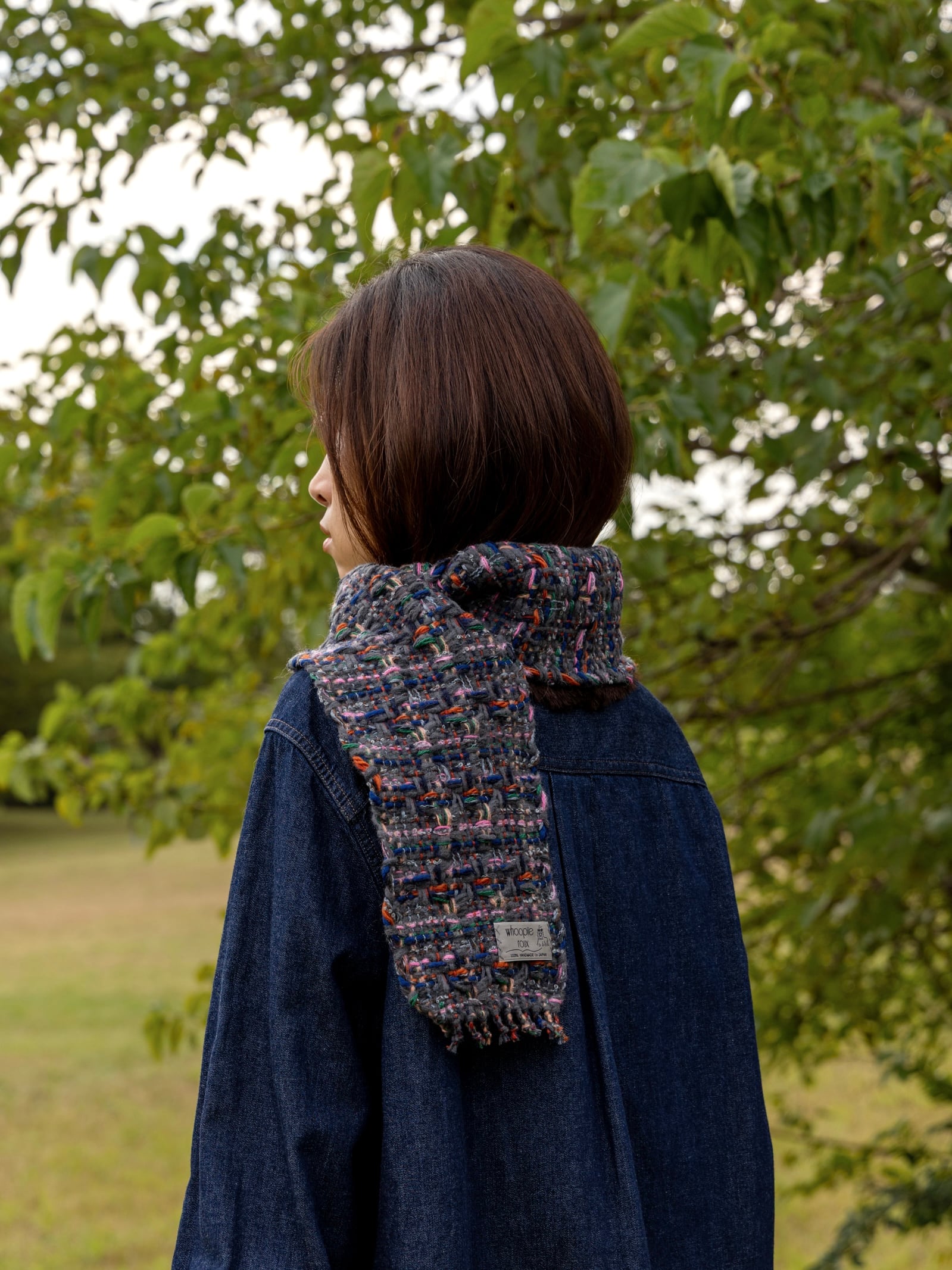 多くの色や質感が織り交ぜられたオリジナルデザインの手織りツイードは、巻くだけで顔周りに彩りを加え、肌色もきれいに見せてくれます。