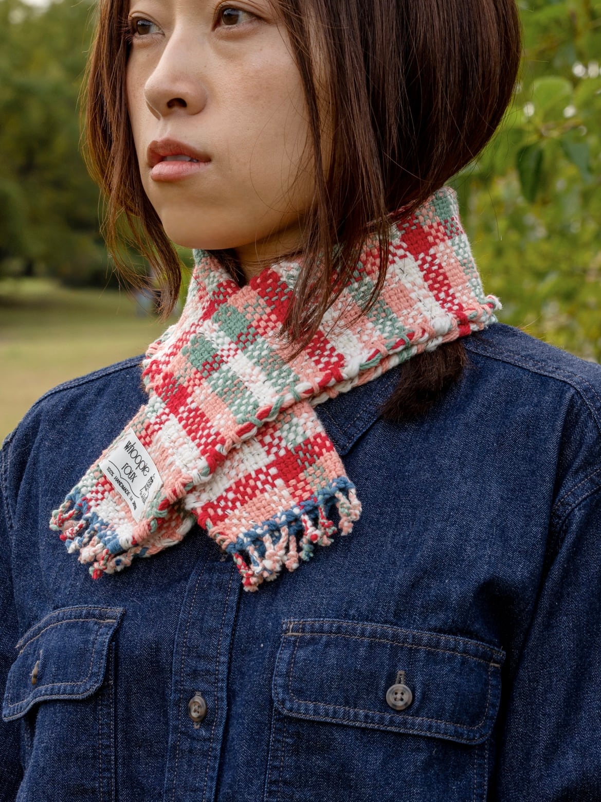 ◯ Fold it in half lengthwise, drape it around your neck, and slip one end through the slit on the other side—it falls perfectly into place.