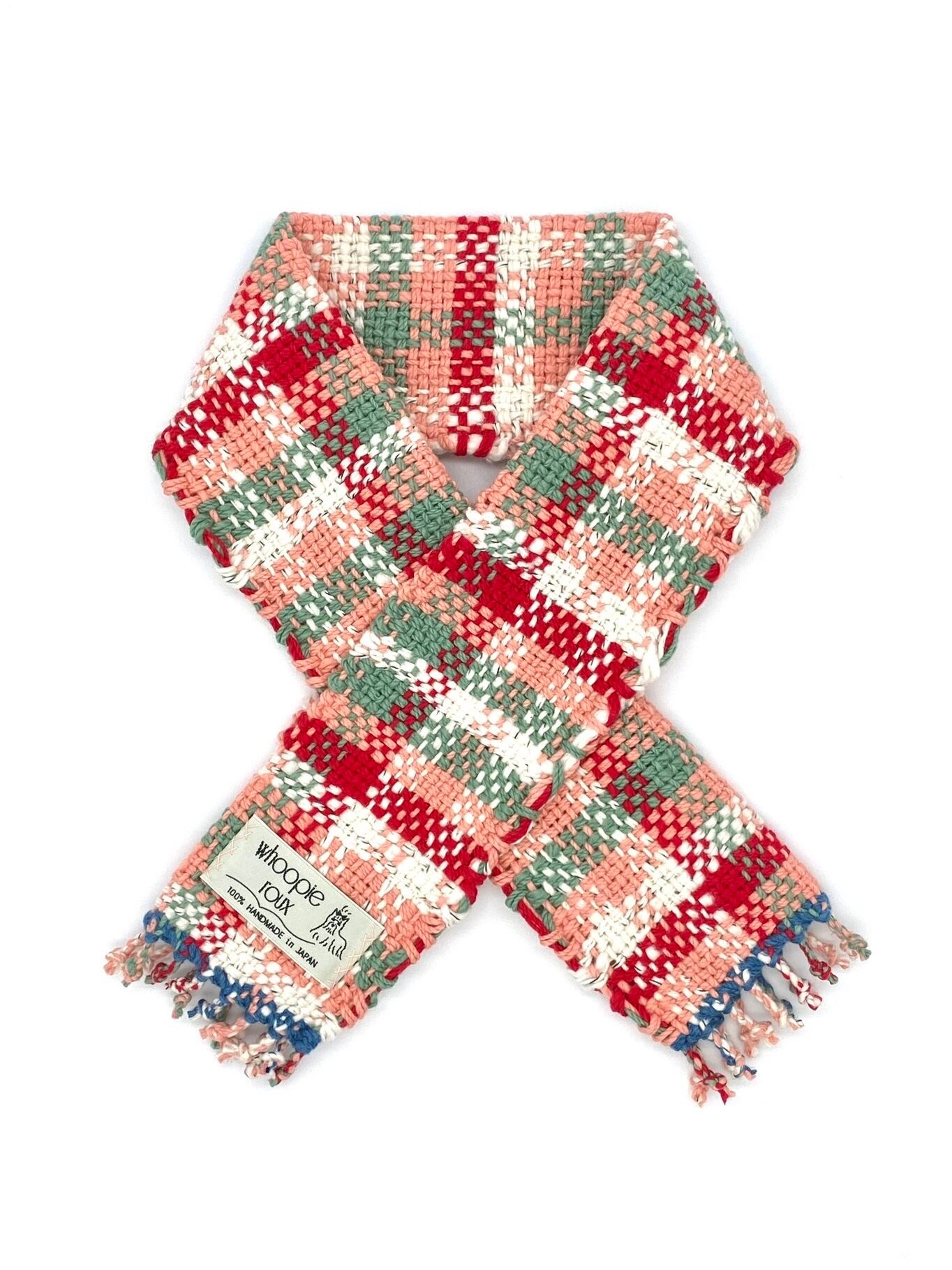 ◯着用は、幅を半分に折って首に掛け、片側のスリットにもう片側を通すだけで 形が整います。