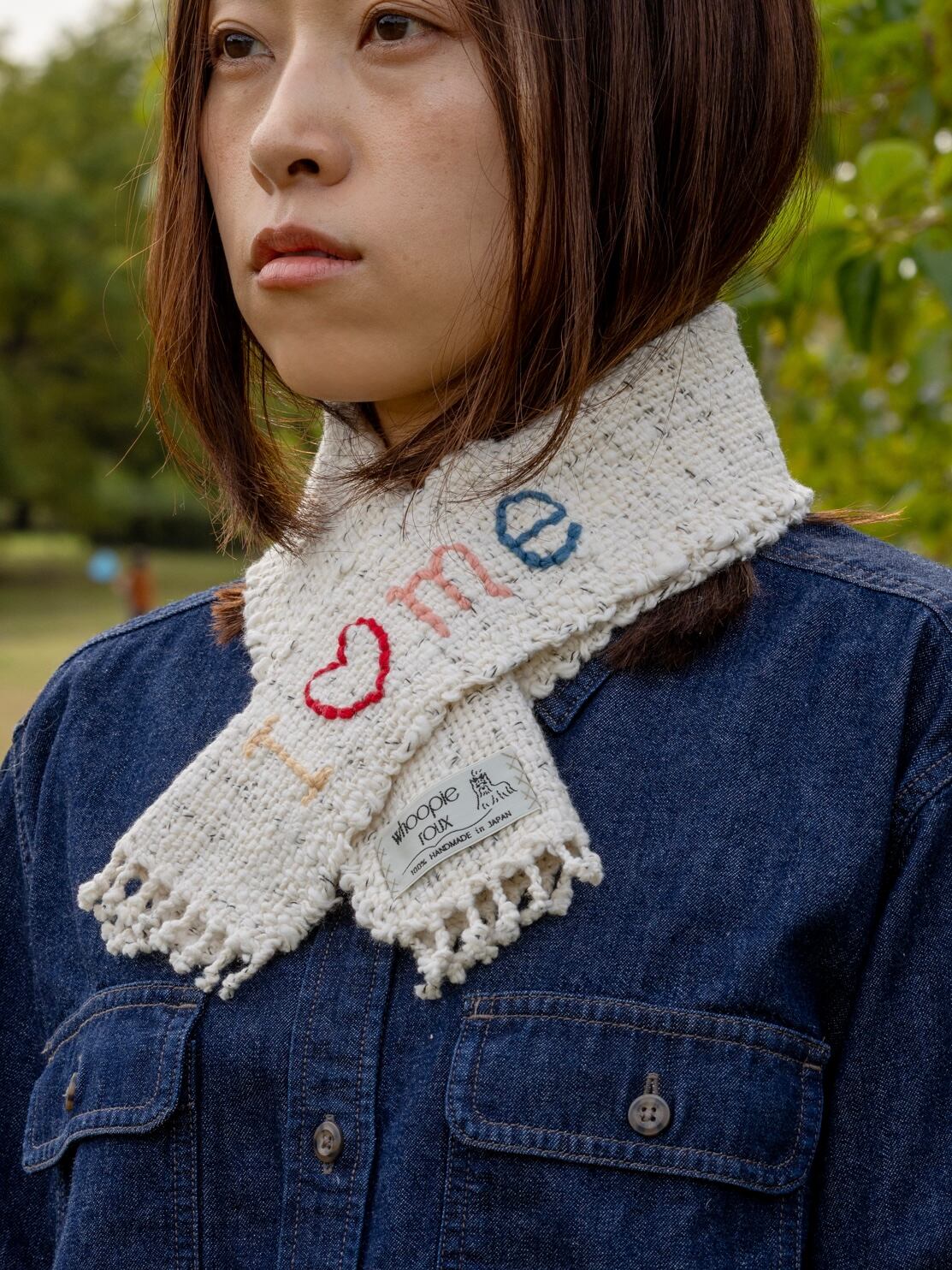 ◯ Fold it in half lengthwise, drape it around your neck, and slip one end through the slit on the other side—it falls perfectly into place.