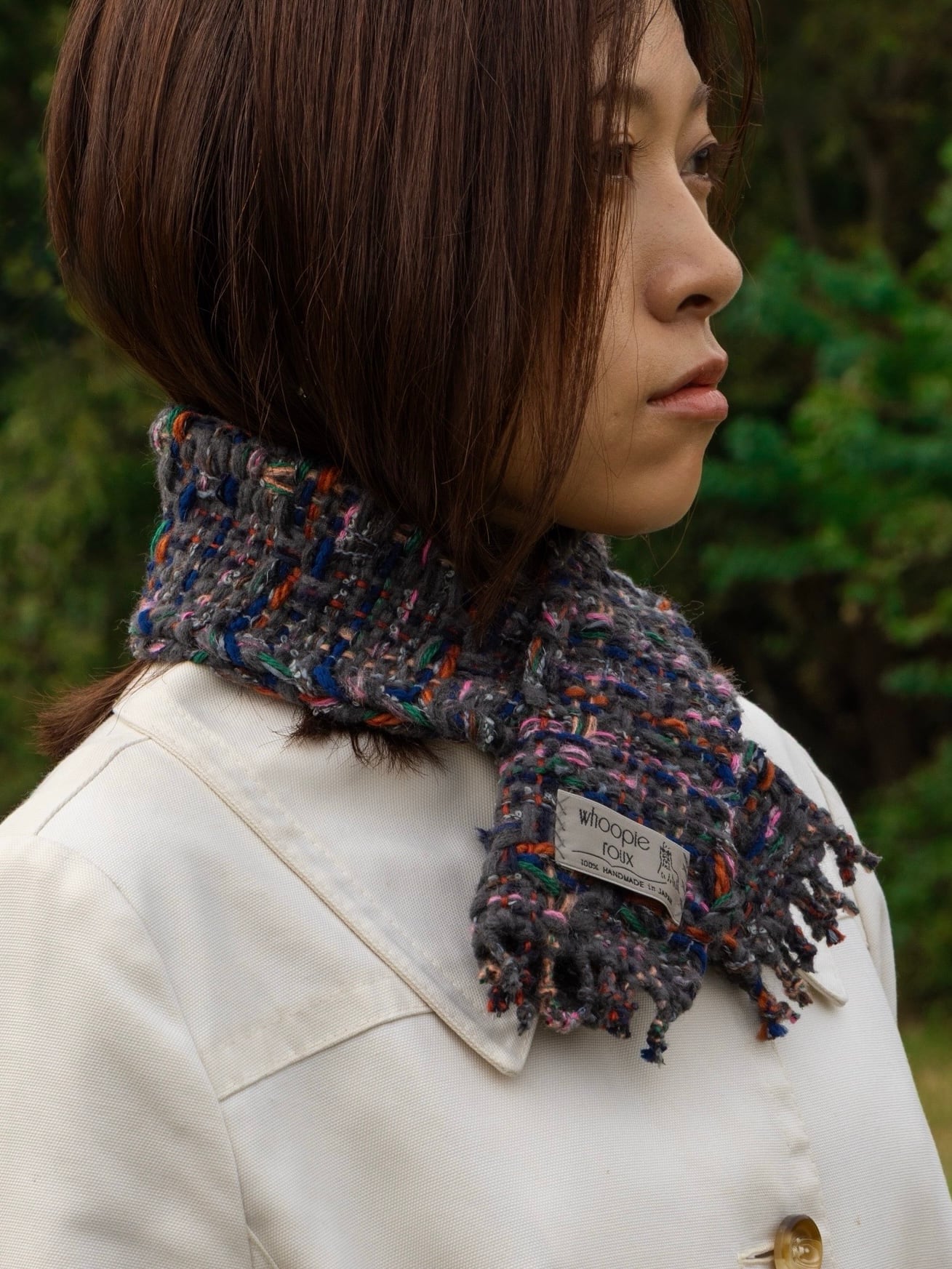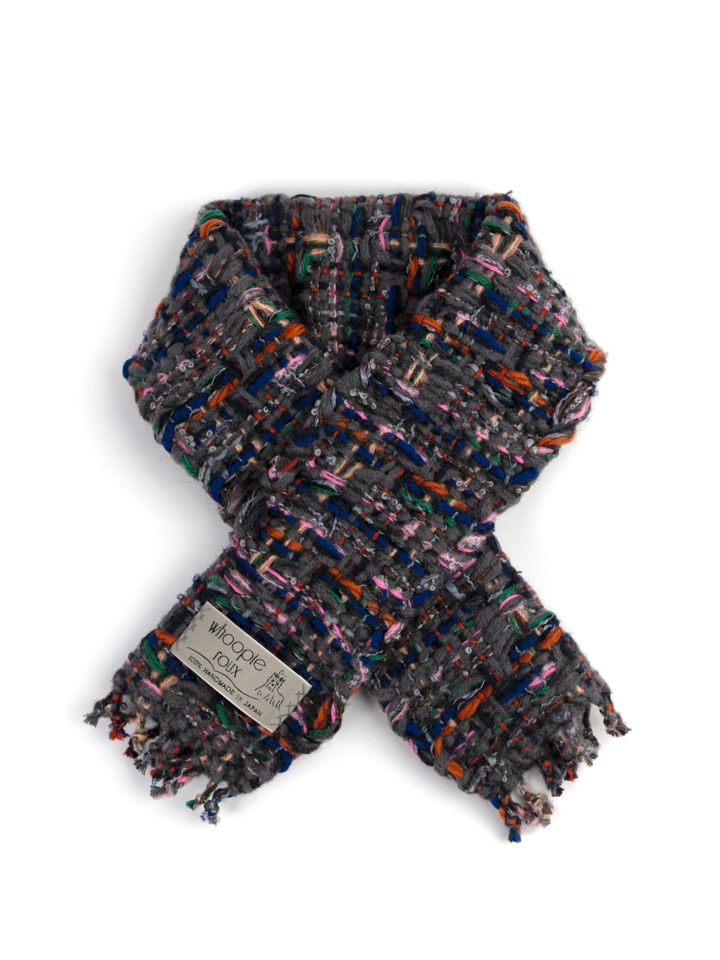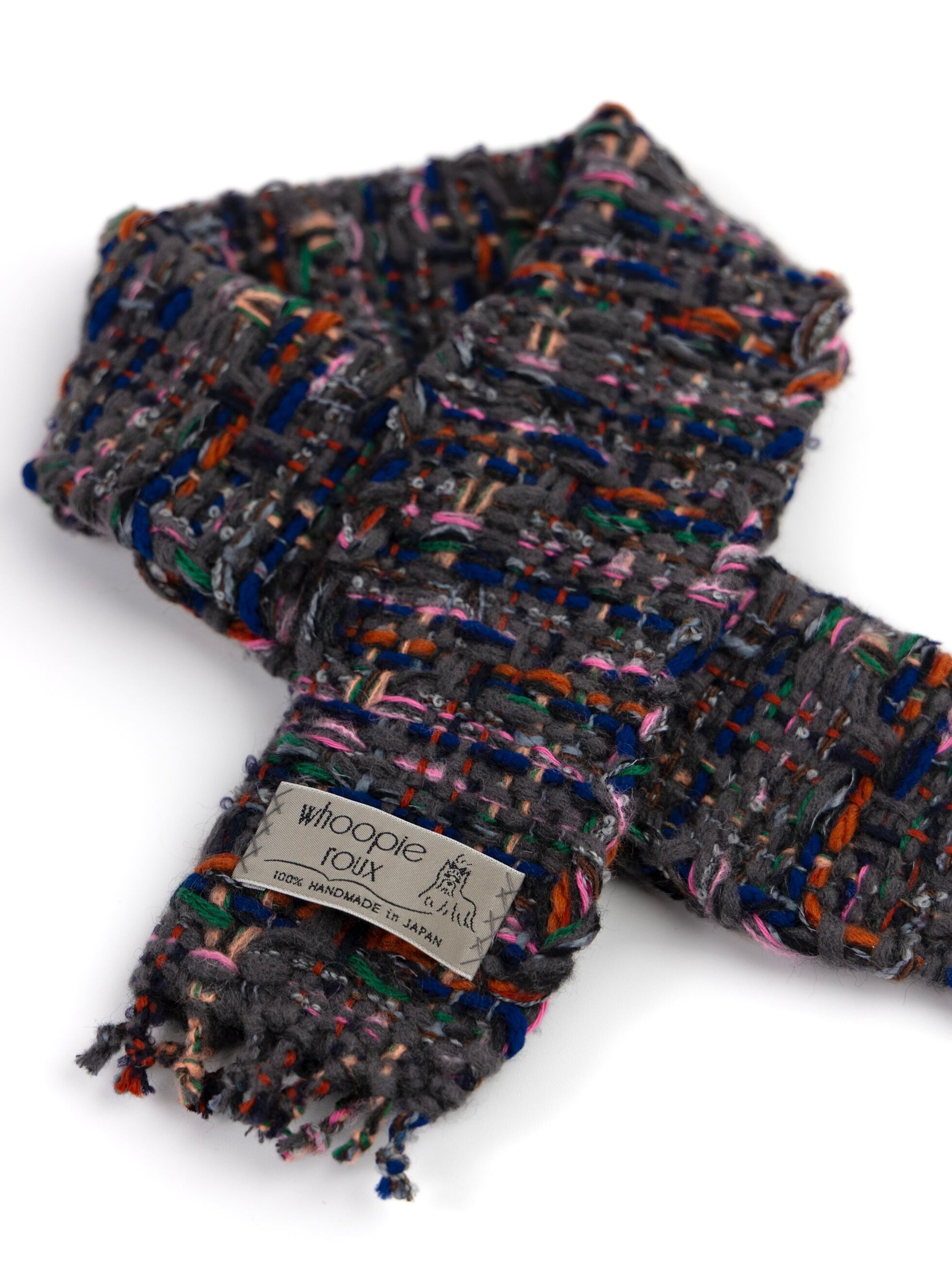 Each handwoven tweed scarf is a whoopie roux original, intricate yet delicate with a touch of cuteness, created from carefully selected leftover yarns from apparel factories—some of which were originally used by high-end brands.