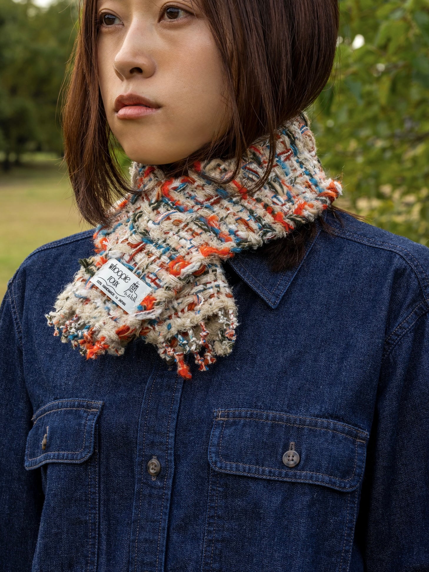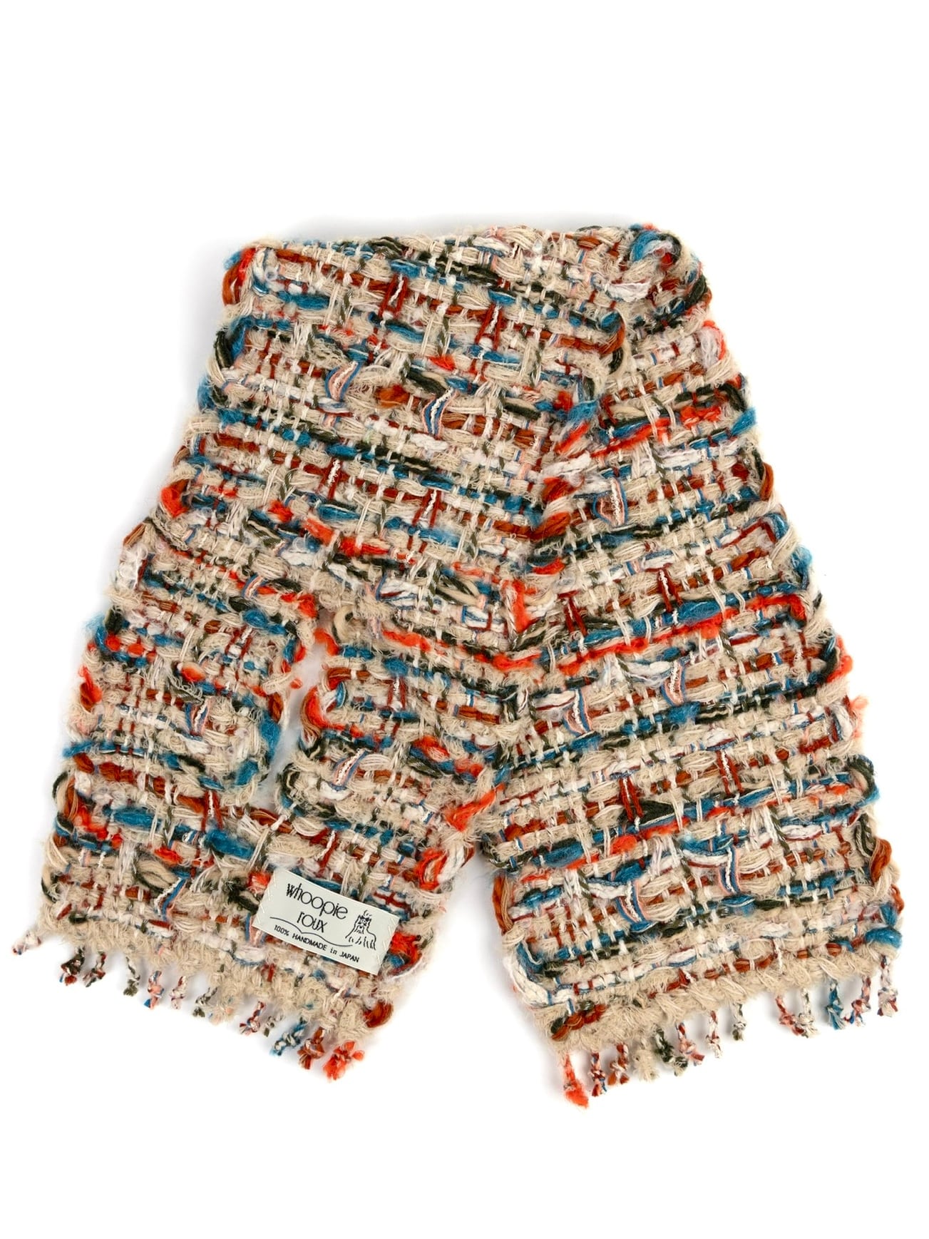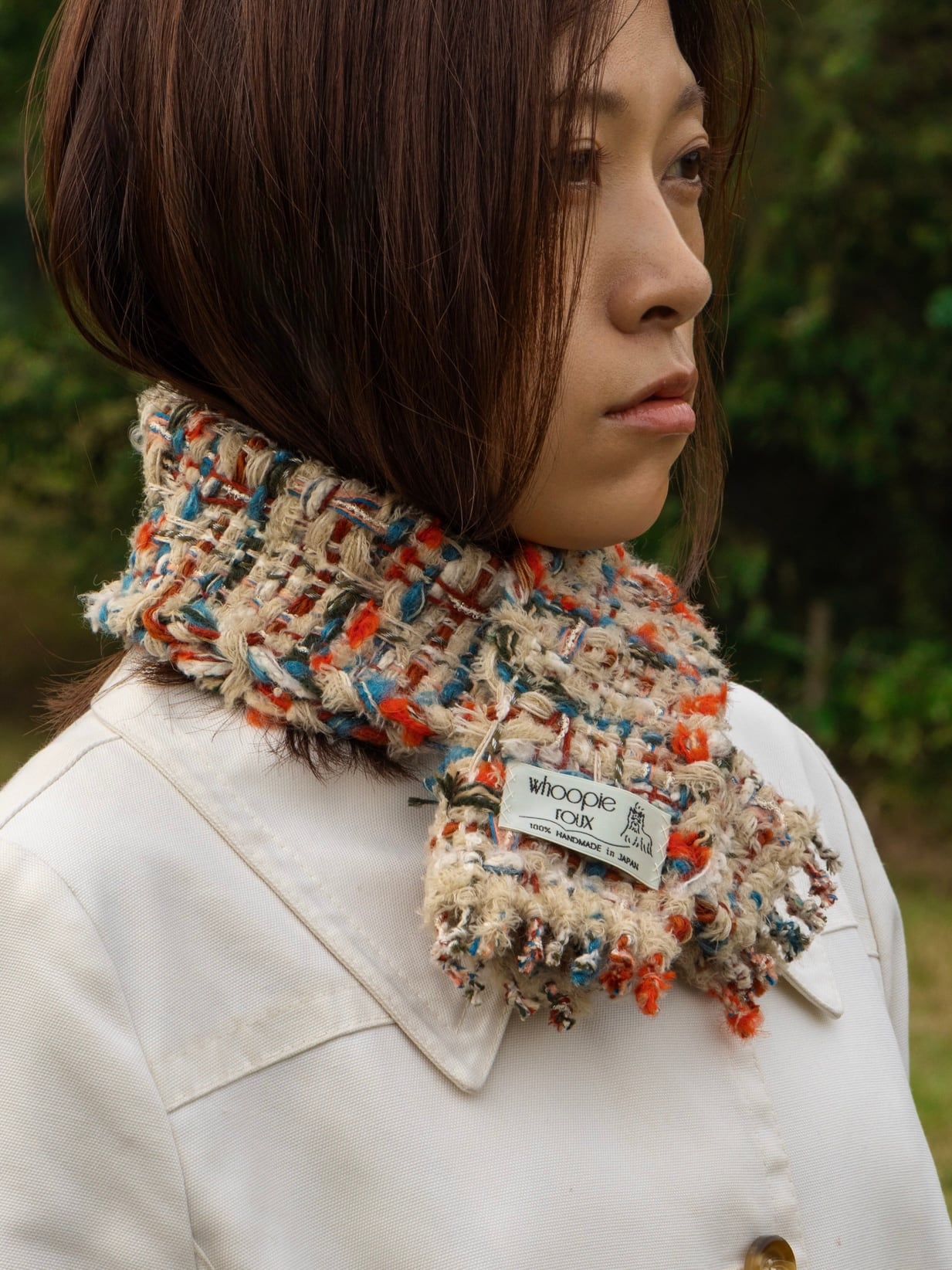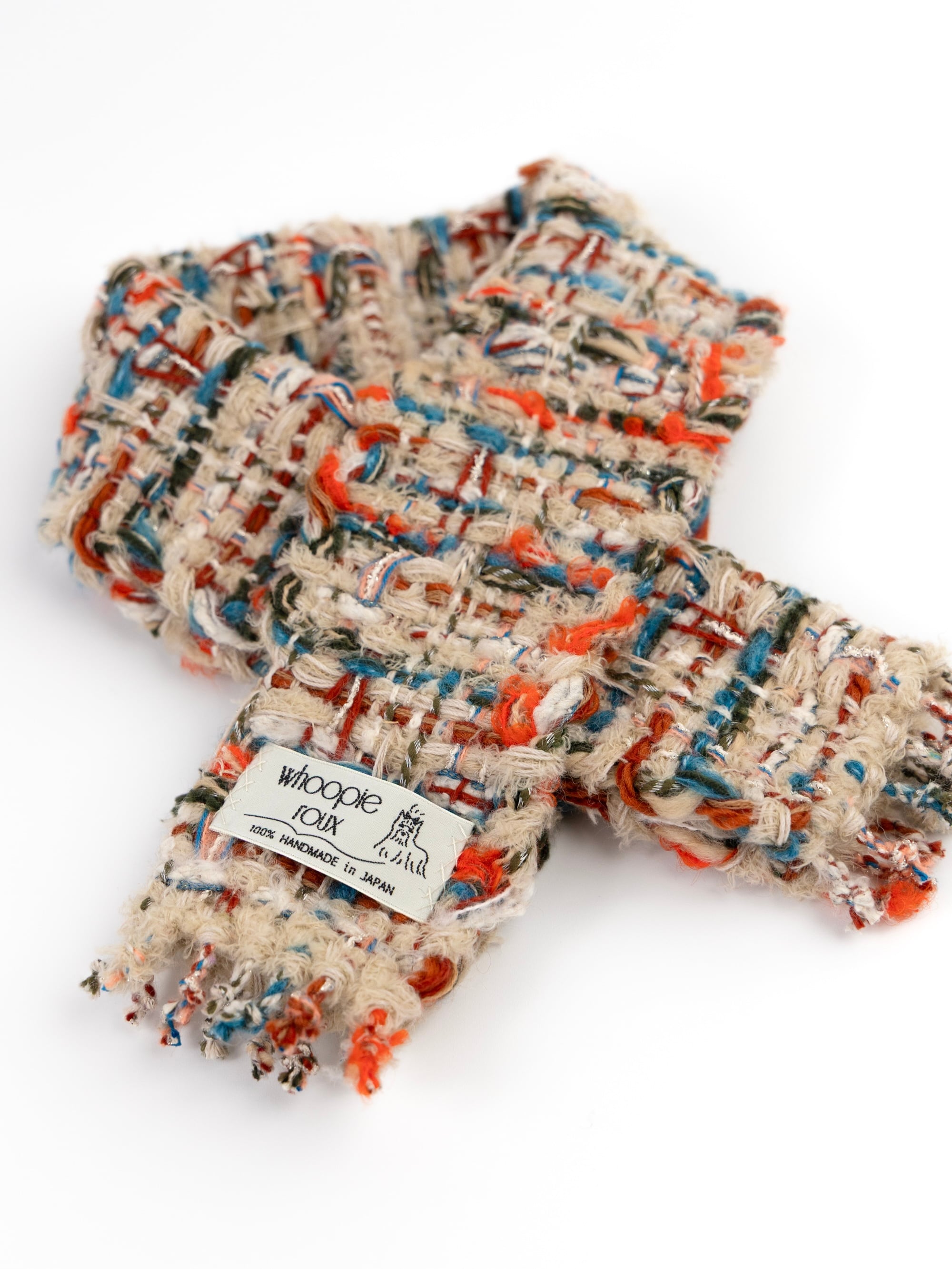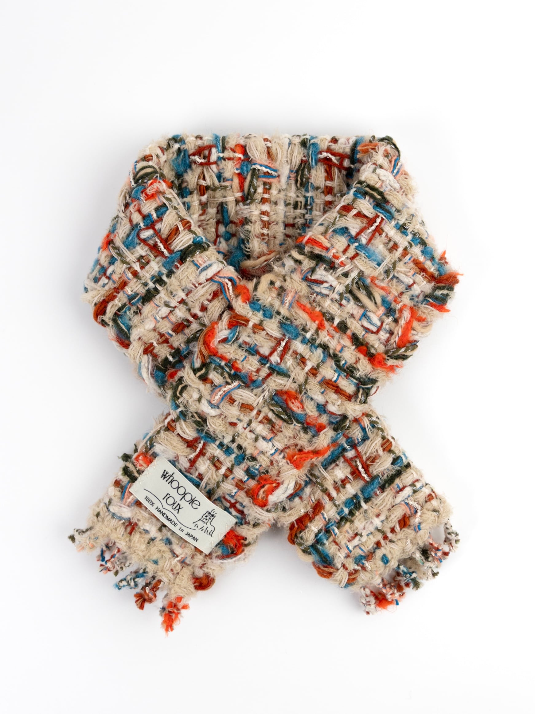 Each handwoven tweed scarf is a whoopie roux original, intricate yet delicate with a touch of cuteness, created from carefully selected leftover yarns from apparel factories—some of which were originally used by high-end brands.