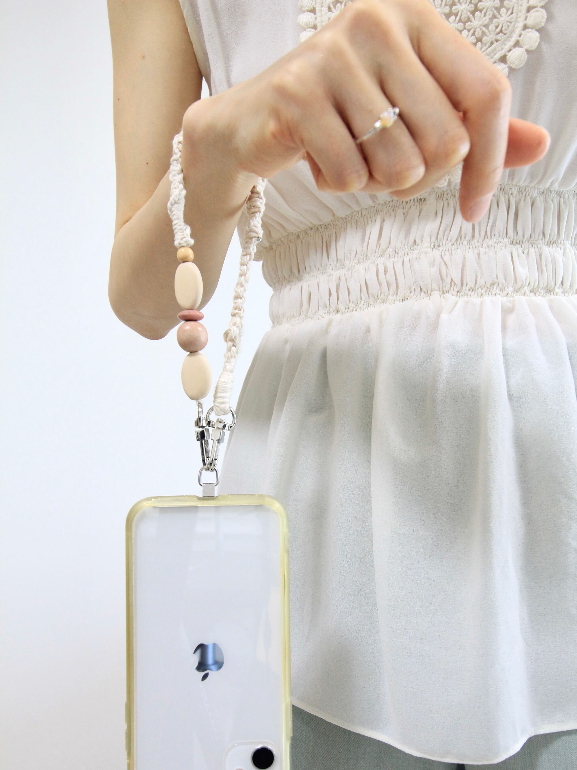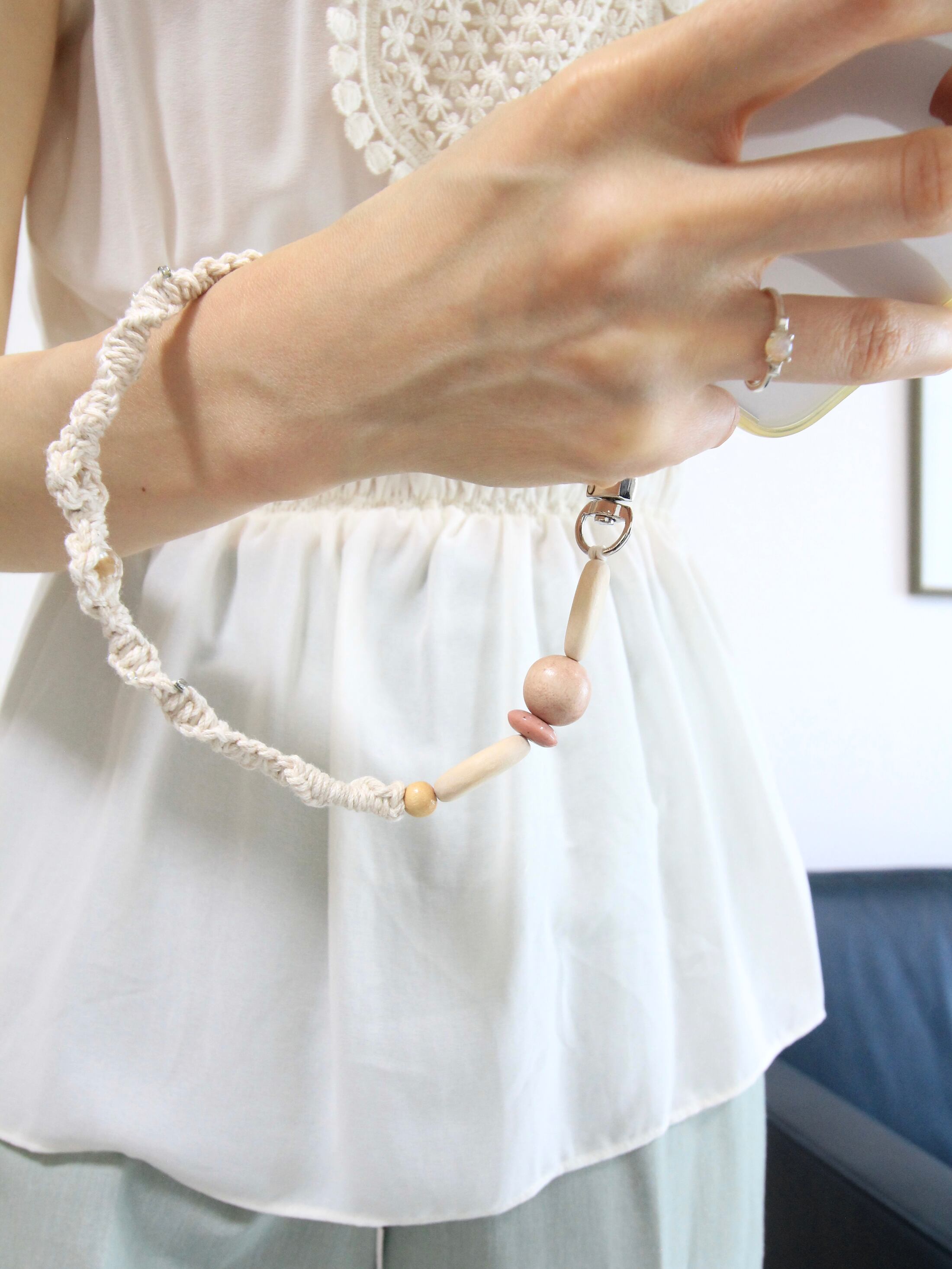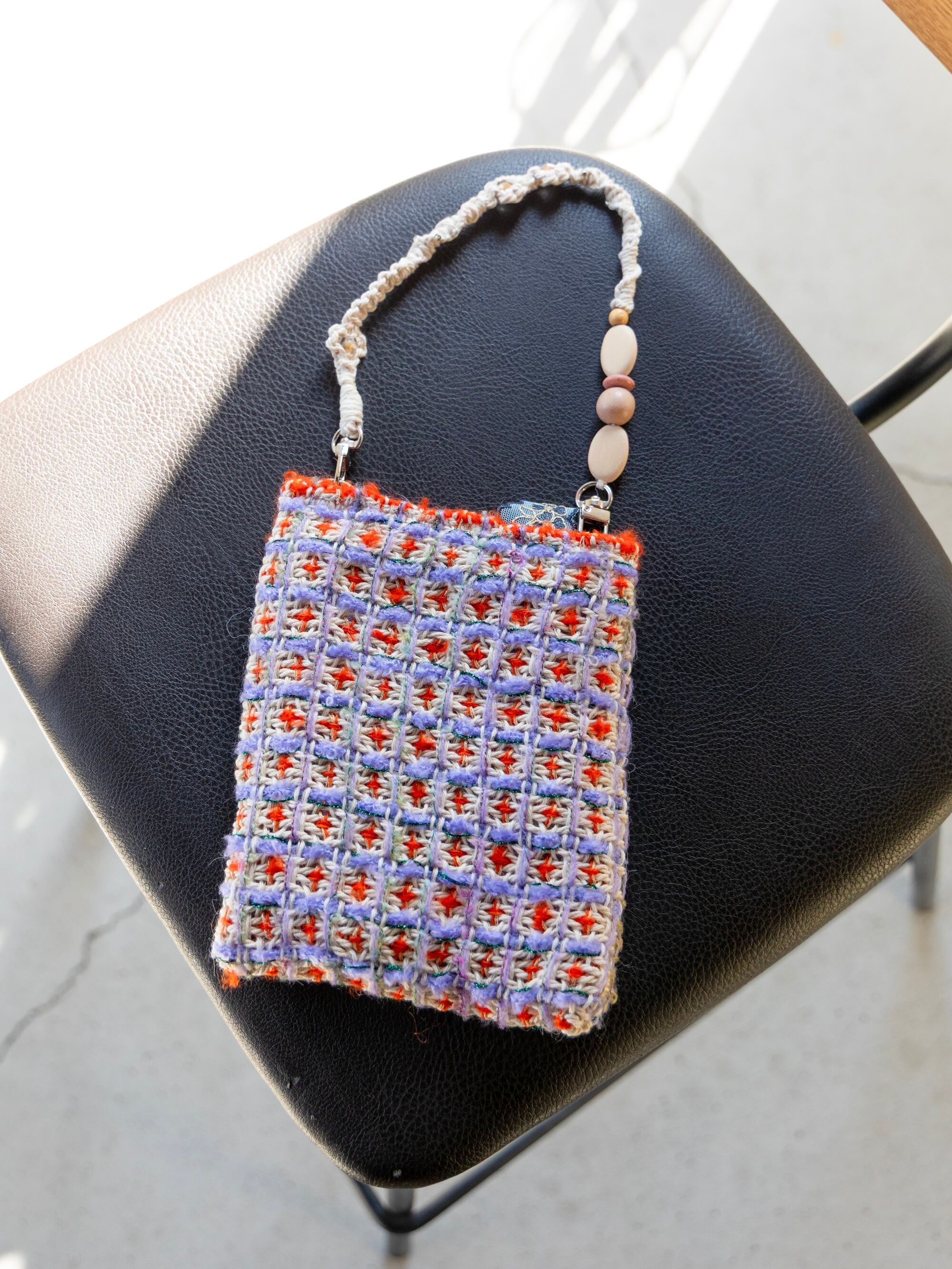 セットのマルチストラップも、同じ芭蕉糸を使用して手編みで制作。積み木みたいな、欧米のヴィンテージビーズがポイントです。