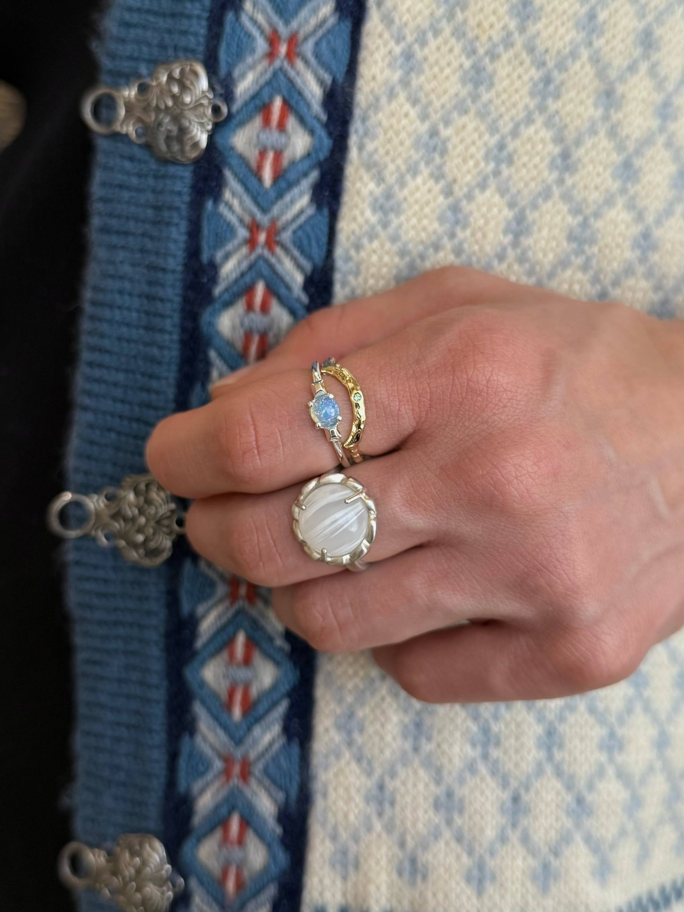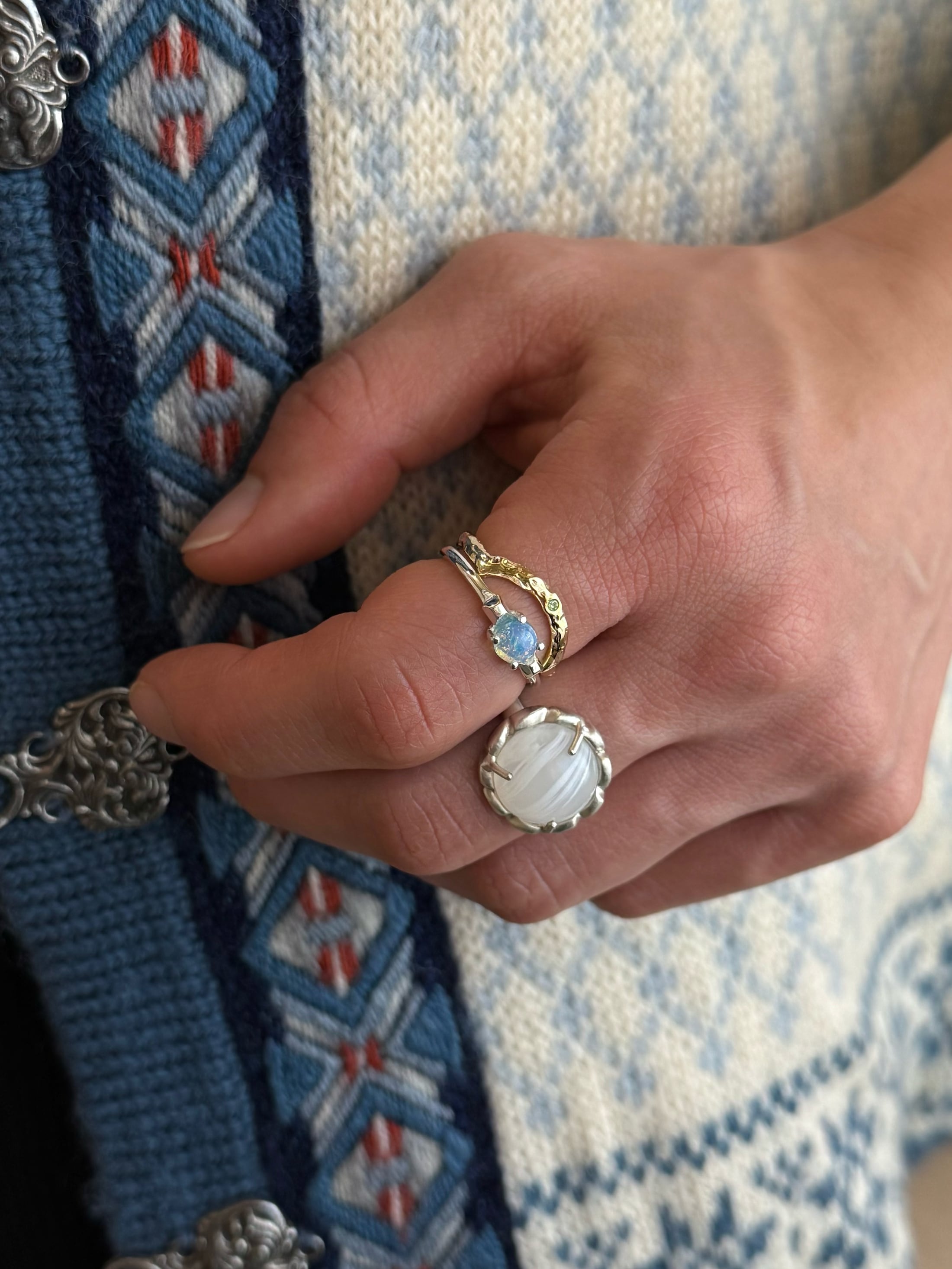 Its vintage glass stone, crafted in an Eastern European workshop, glimmers with unique inclusions in each piece, like a real opal—yet it is durable enough for daily wear.