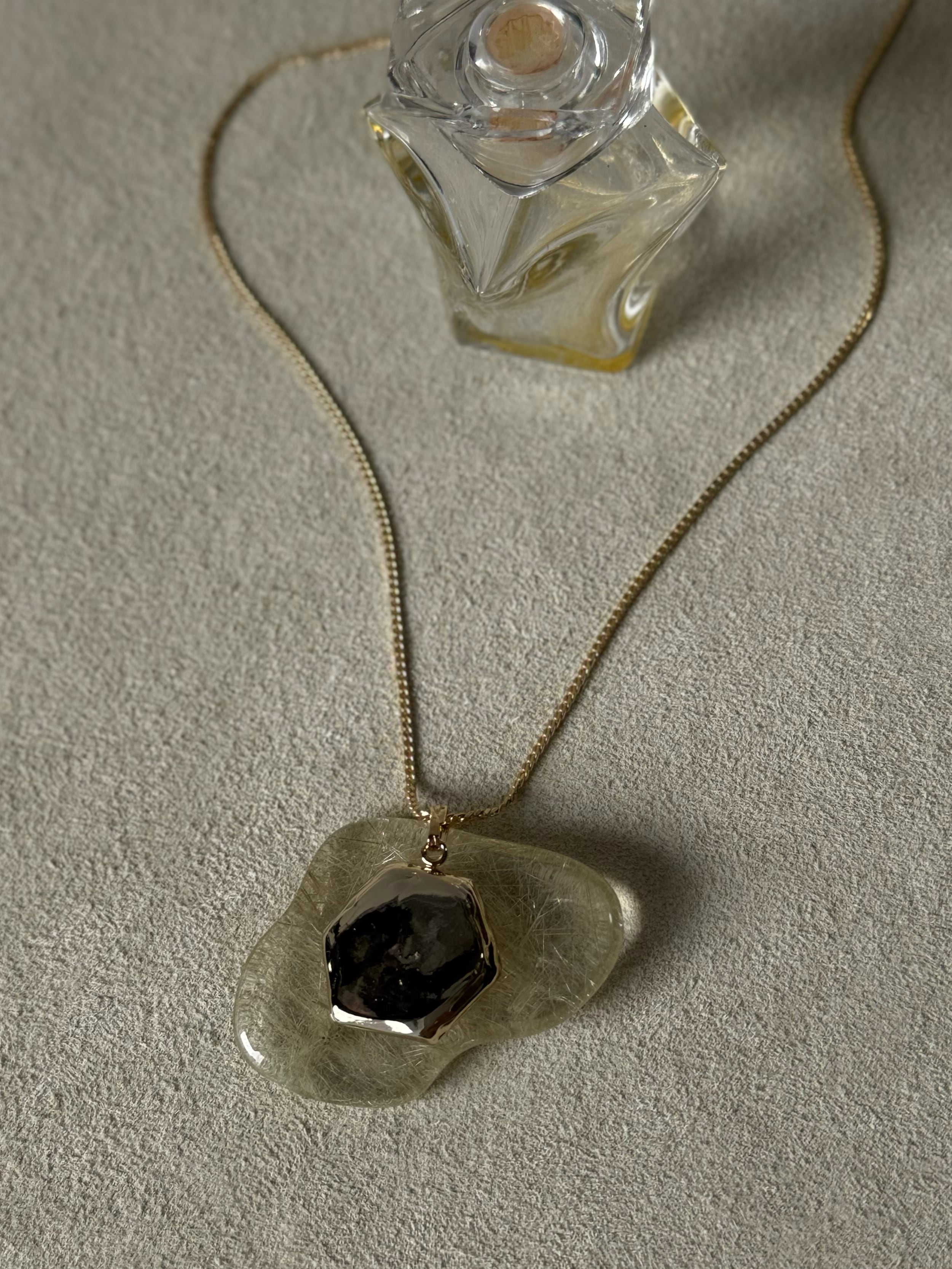 金属がとろけたような裏面を表にしてもおたのしみ頂ける、リバーシブル仕様のネックレスです。