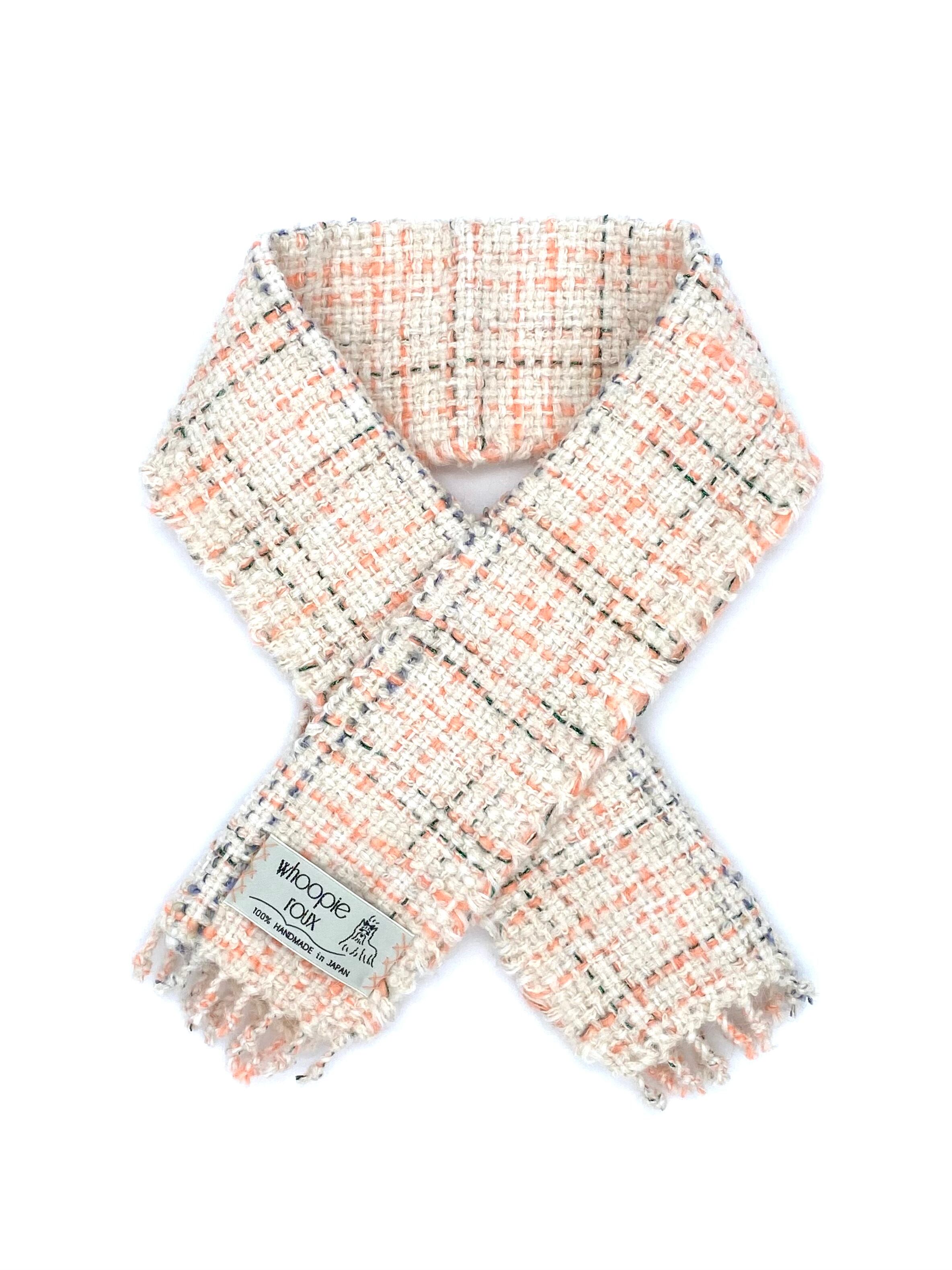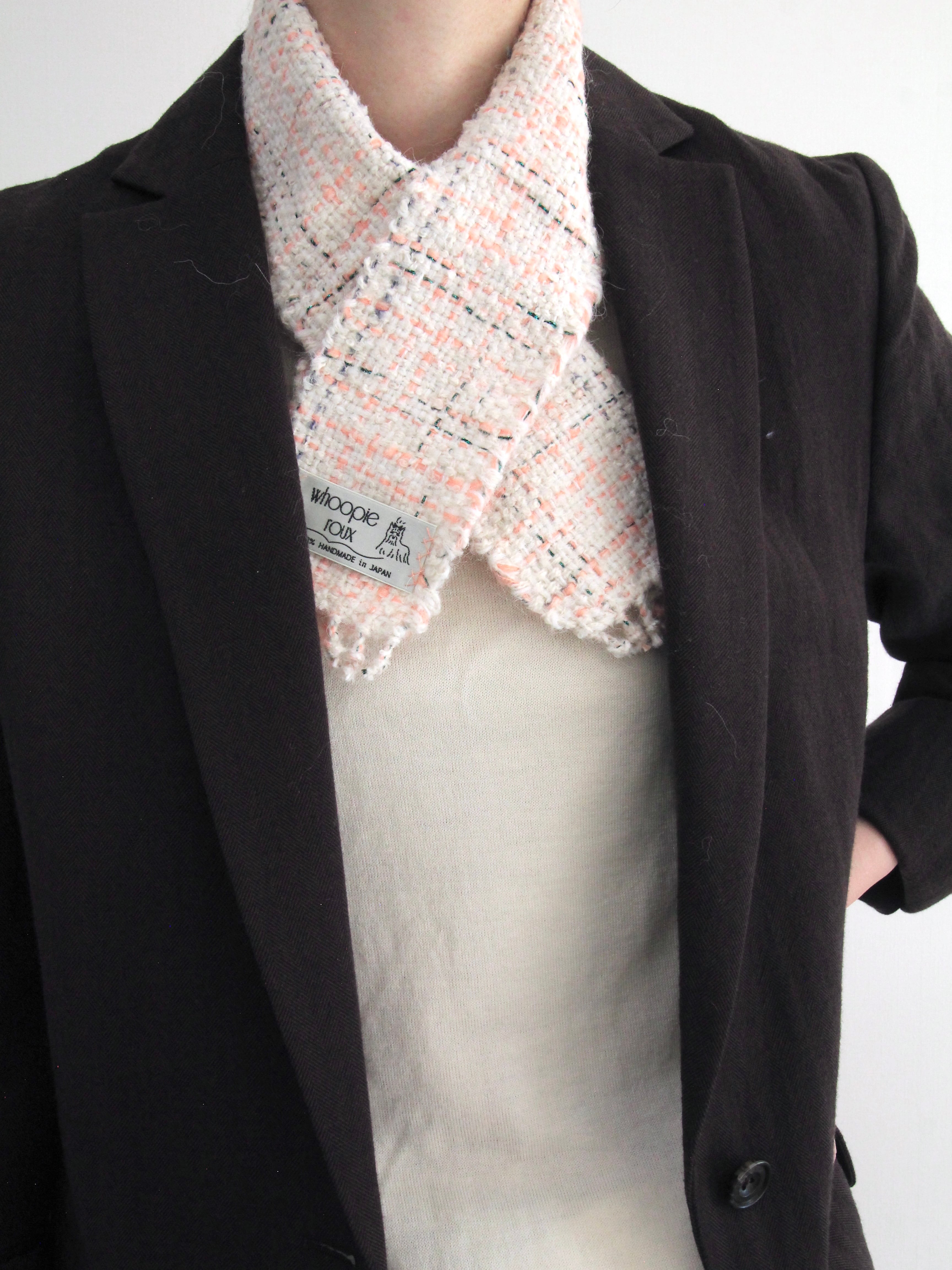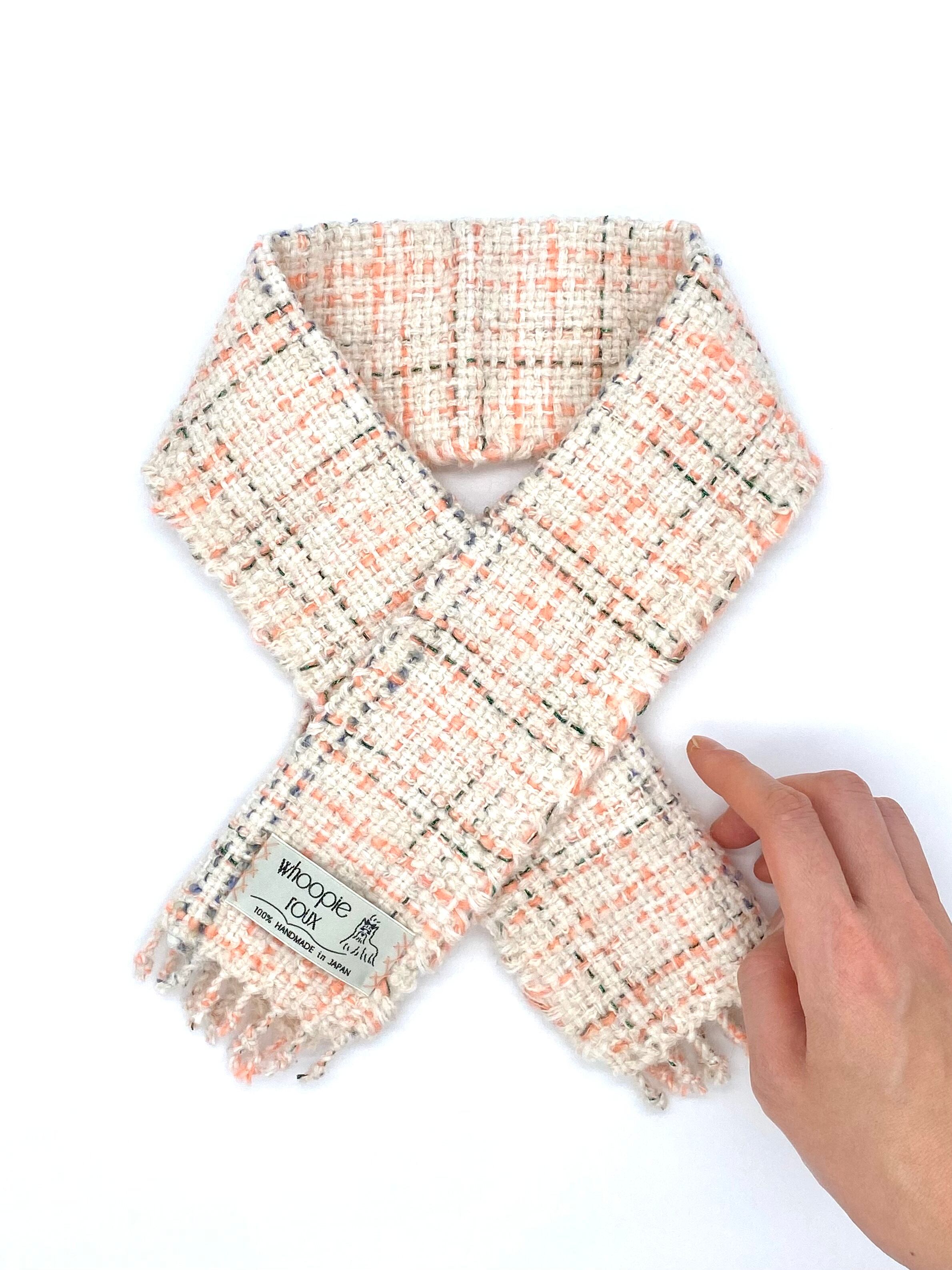 Each handwoven tweed scarf is a whoopie roux original, intricate yet delicate with a touch of cuteness, created from carefully selected leftover yarns from apparel factories—some of which were originally used by high-end brands.
