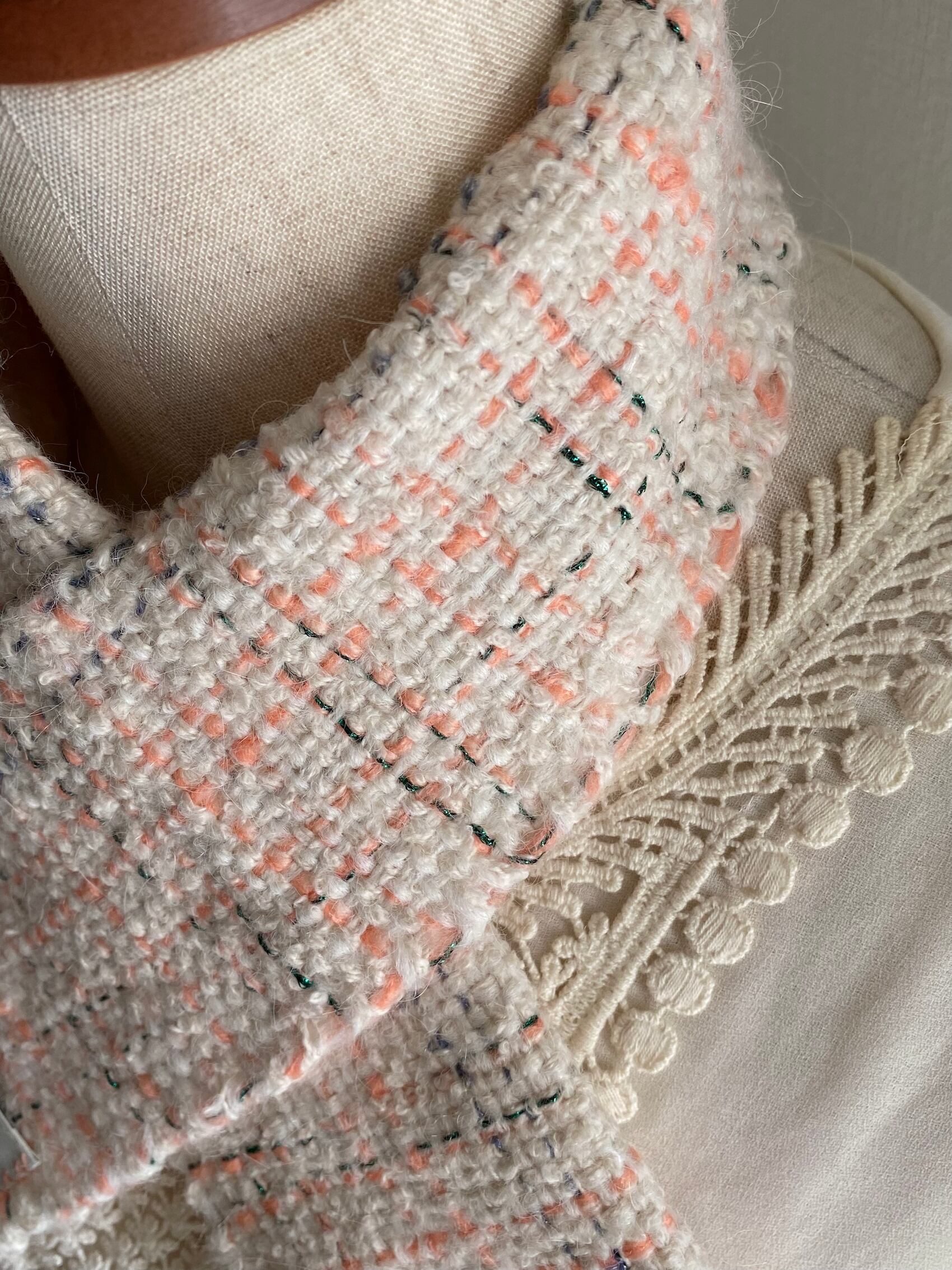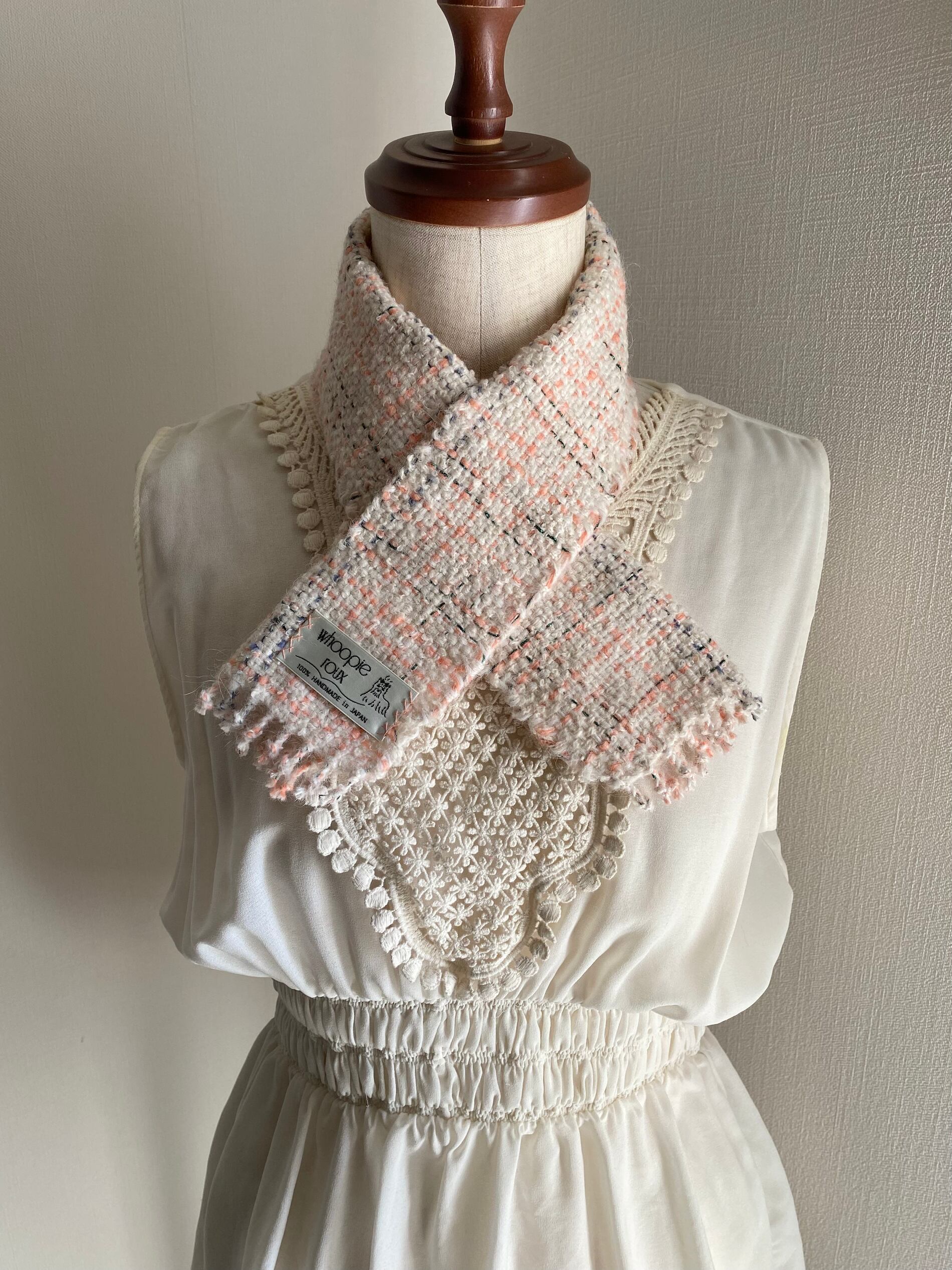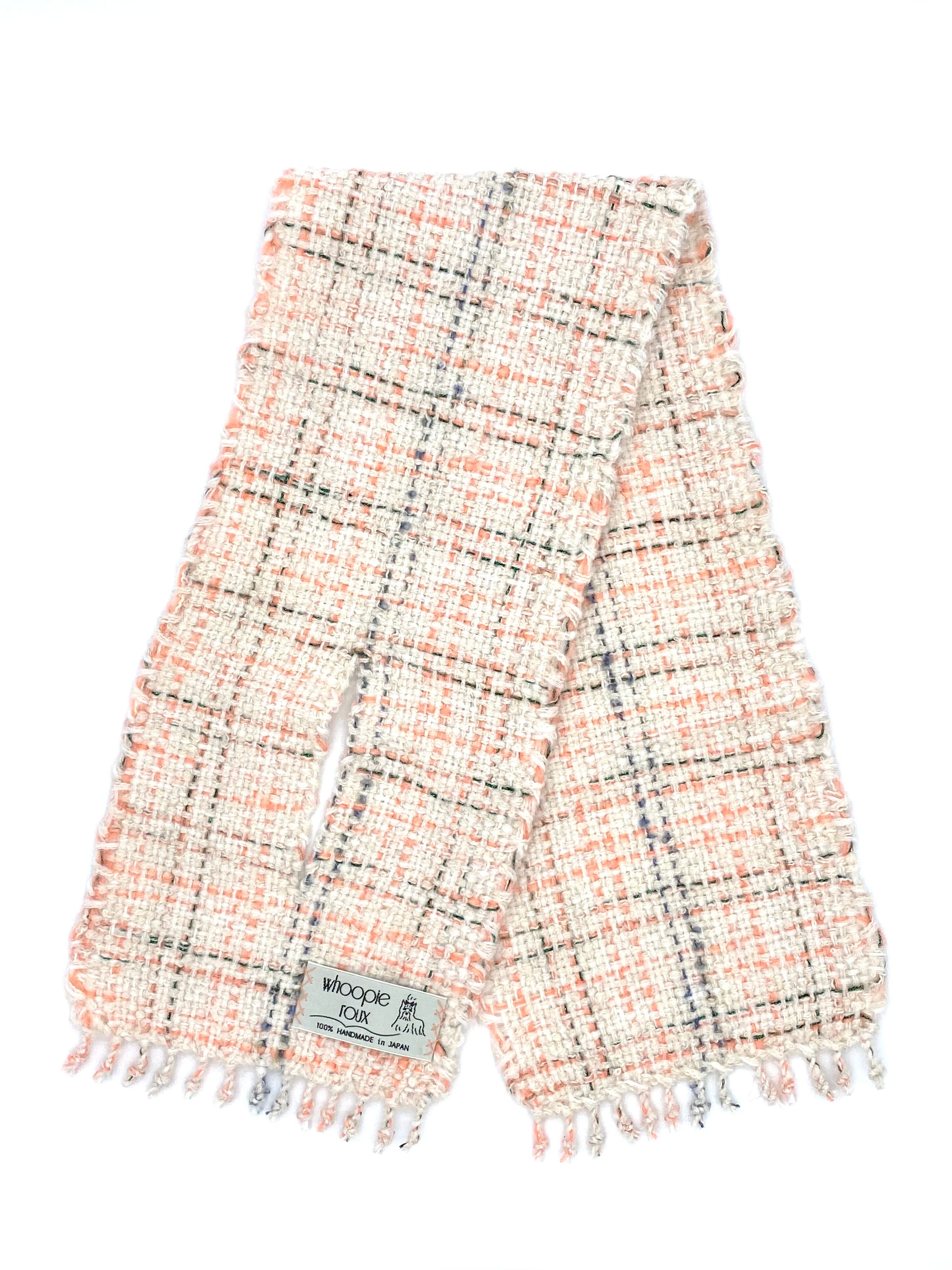 Each handwoven tweed scarf is a whoopie roux original, intricate yet delicate with a touch of cuteness, created from carefully selected leftover yarns from apparel factories—some of which were originally used by high-end brands.